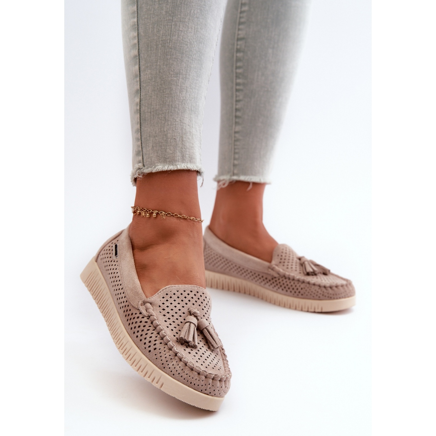 Mocasini de dama din piele intoarsa ecologica. Montat pe o platformă. Degetele rotunjite. Față decorată cu mici franjuri. Acest model are o inserție moale din piele naturală, care asigură confort atunci când este purtat. Un stil clasic care se va potrivi atât cu stilurile casual, cât și cu cele elegante.
