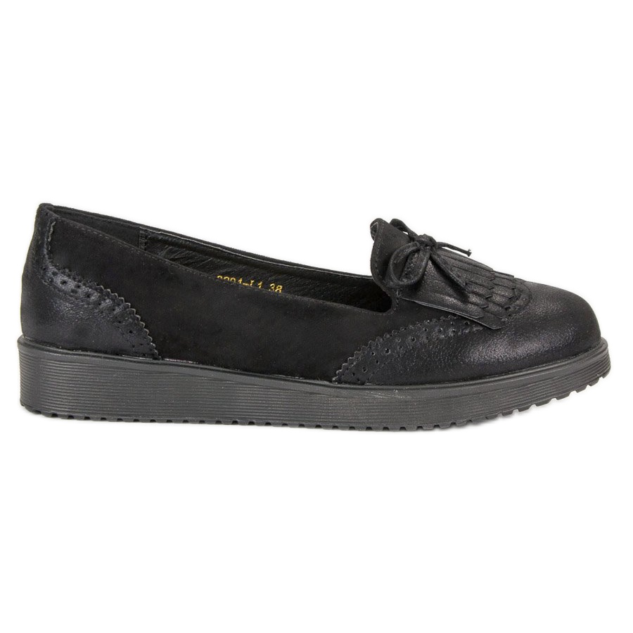 Designul acestor mocasini atrage atenția - ajurat delicat și franjuri decorative și o fundă adaugă lejeritate și eleganță pantofilor, iar culorile negre îi fac să se potrivească cu multe stiluri. Este o combinație perfectă de clasic și modern care va satisface gustul chiar și al celor mai pretențioase femei.