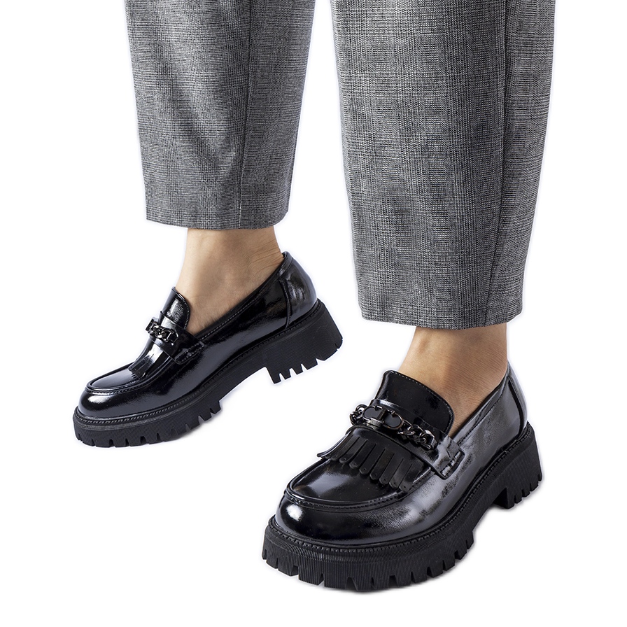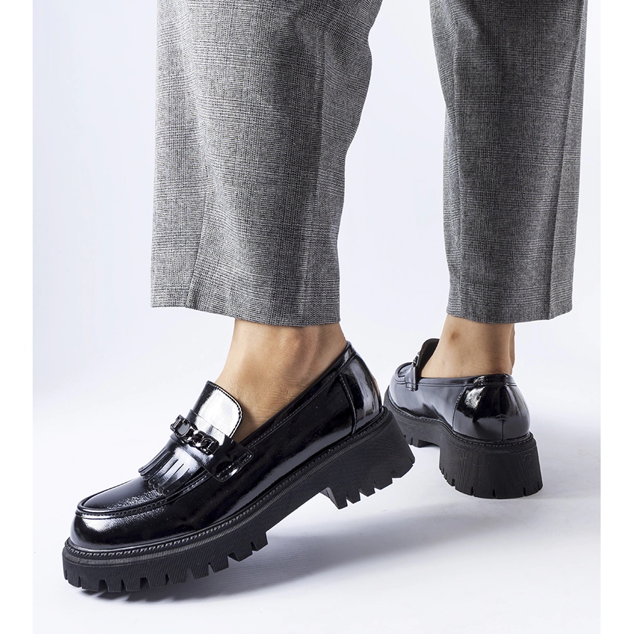 Mocasinii sunt confectionati din piele ecologica lacuita de inalta calitate, ceea ce ii face sa arate extrem de impresionant. Finisajul negru le subliniază caracterul rafinat, iar elementele suplimentare sub formă de cataramă și franjuri le conferă un accent la modă.