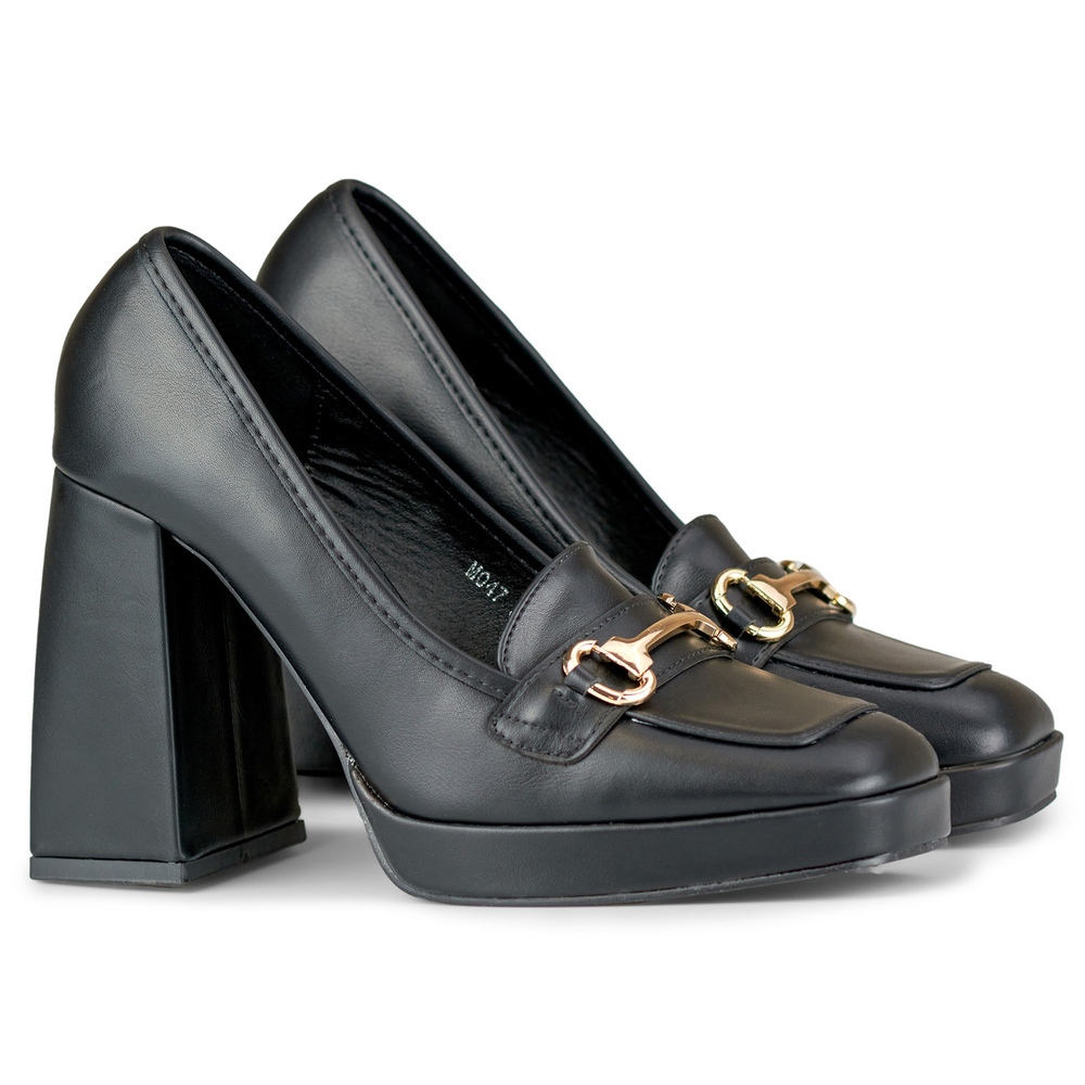 Plăcile negre pe un călcâi înalt și confortabil sunt o combinație de clasici și stil modern - ideal pentru femeile care apreciază zilnic eleganța și confortul și în timpul ieșirilor majore.