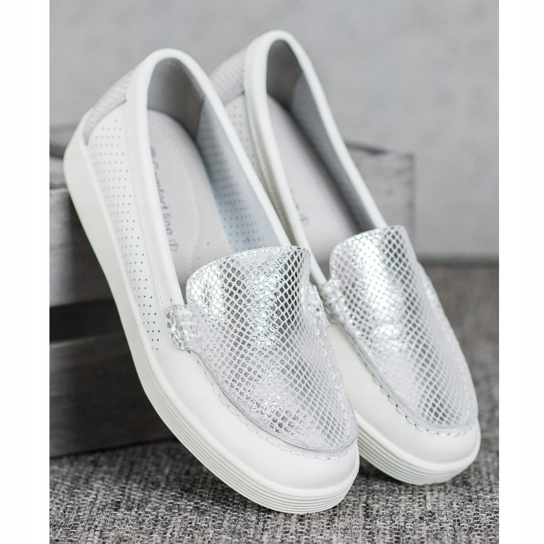 Mocasinii cu platforma VINCEZA in alb si gri sunt alegerea perfecta pentru femeile care apreciaza eleganta si confort. Acești pantofi clasici, delicati, sunt confecționați din piele naturală de înaltă calitate, ceea ce asigură durabilitate și un aspect elegant. Un accent interesant este detaliul argintiu plasat pe partea superioară a pantofului, care le conferă un caracter modern.