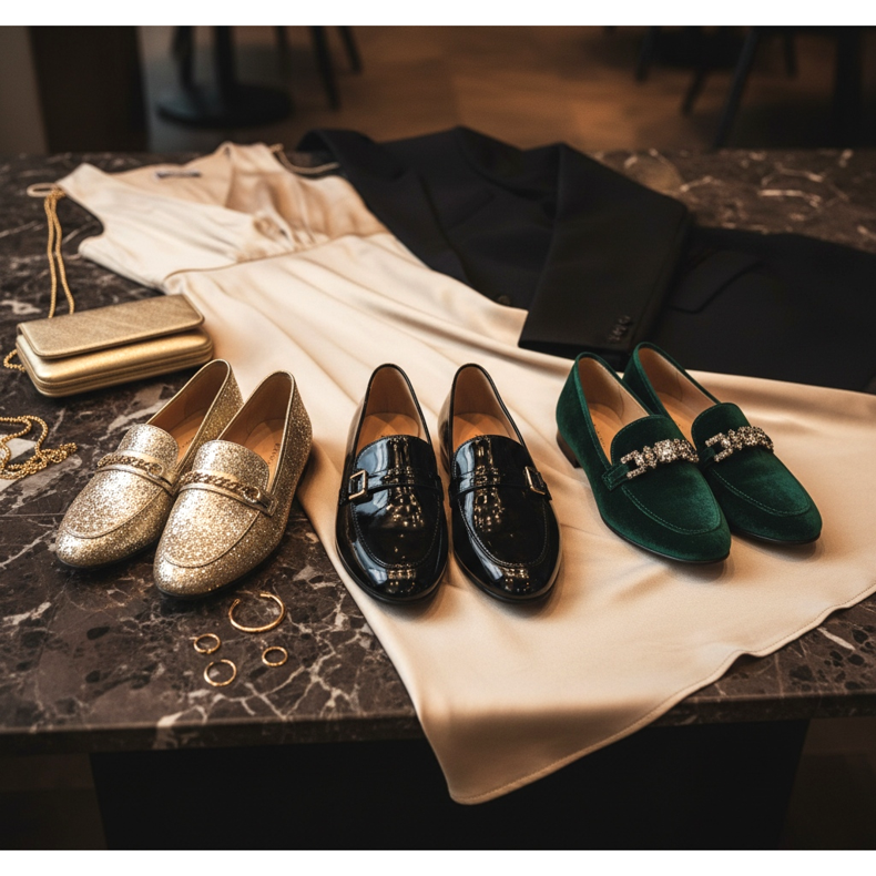 Pentru o ieșire de seară, alege mocasini cu un finisaj strălucitor. Combină-le cu un costum elegant sau cu o rochie midi din satin. Adauga bijuterii din aur si o geanta de seara cu lant - efectul WOW este garantat.