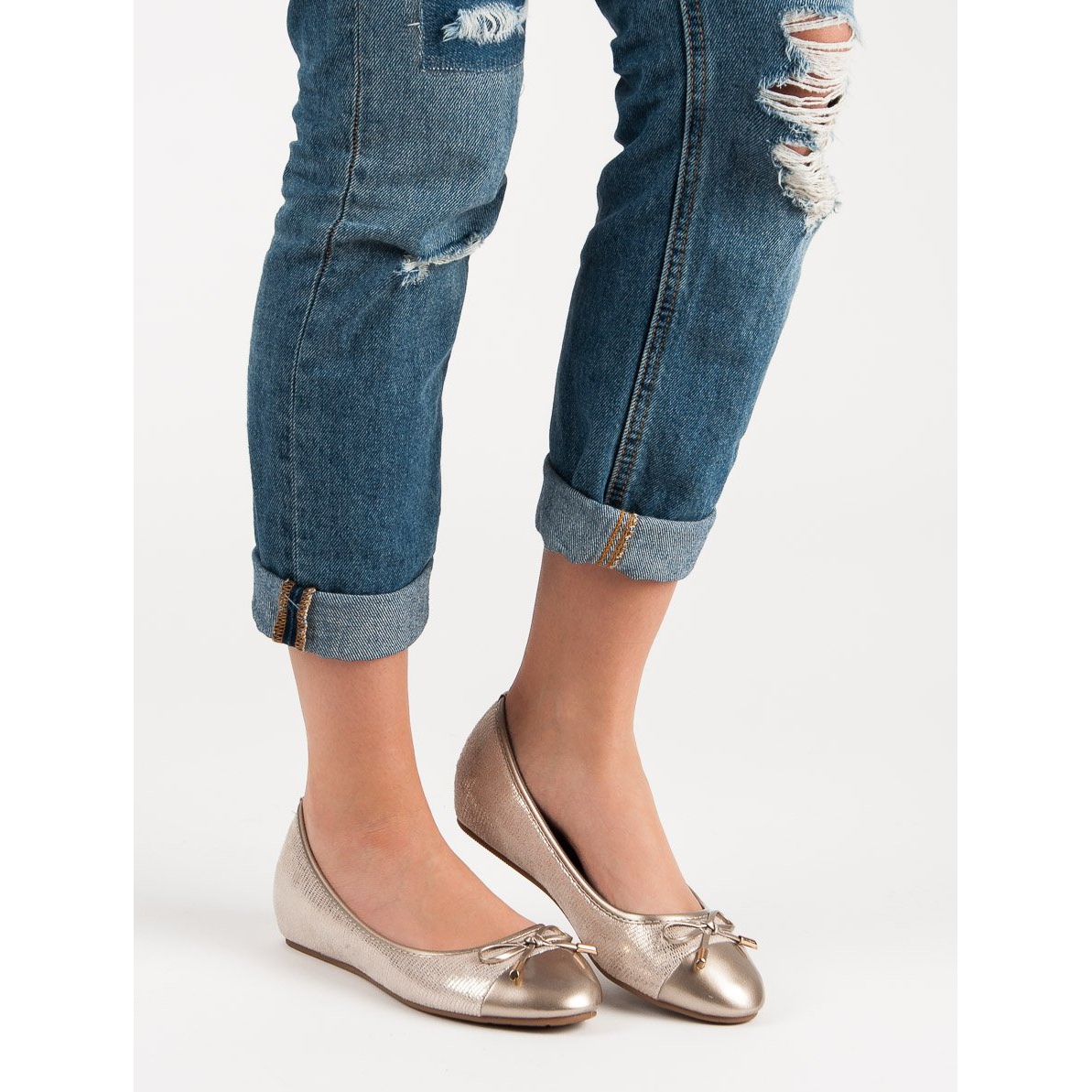 Acești balerini se disting printr-o culoare subtil strălucitoare care combină nuanțe de aur și galben, care creează un accent spectaculos și atrăgător ținutei tale. Fără model, dar cu decorațiuni interesante și o fundă fermecătoare, adaugă eleganță oricărei ținute.