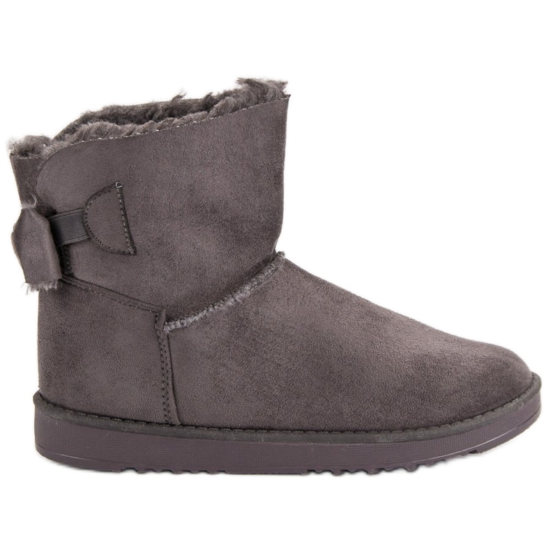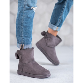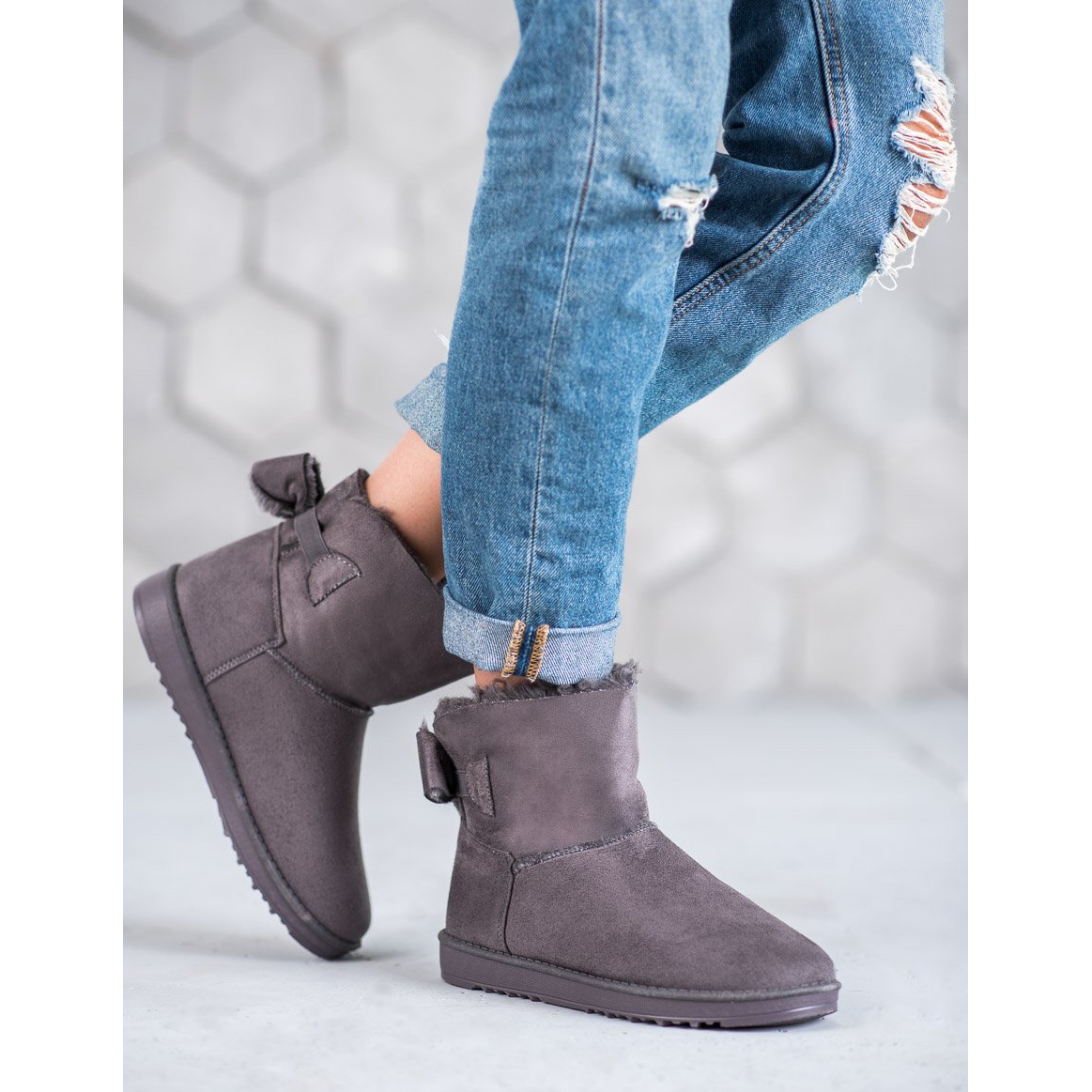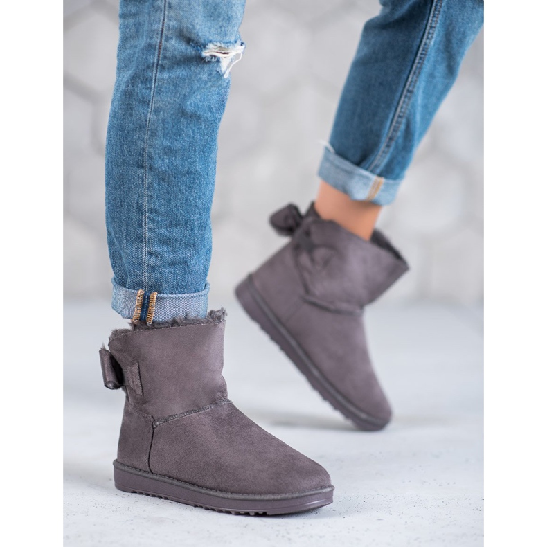 Mukluk-urile gri cu fundă sunt alegerea perfectă pentru viitorul sezon de toamnă-iarnă pentru fiecare femeie care apreciază combinația de confort și stil. Confectionati din piele intoarsa ecologica, acesti pantofi nu numai ca arata extrem de elegant, dar iti infasoara placut picioarele, pastrandu-le calde datorita izolatiei din blana din interior.