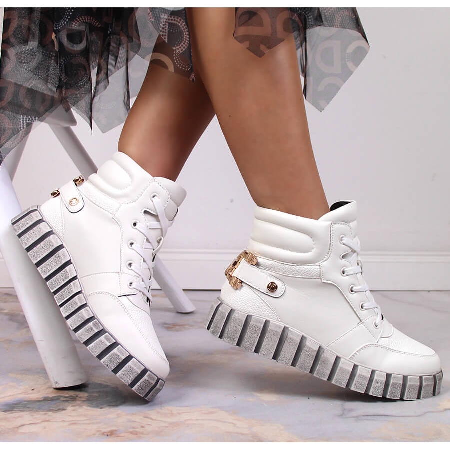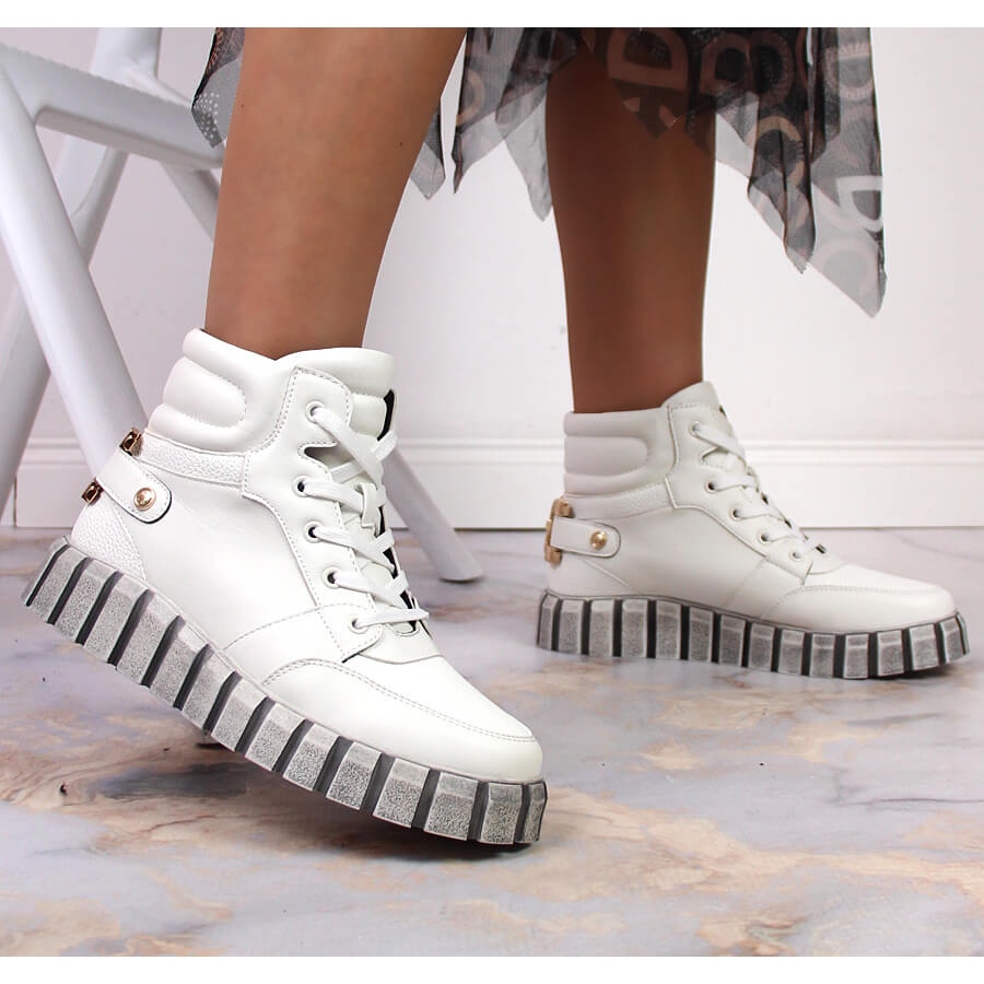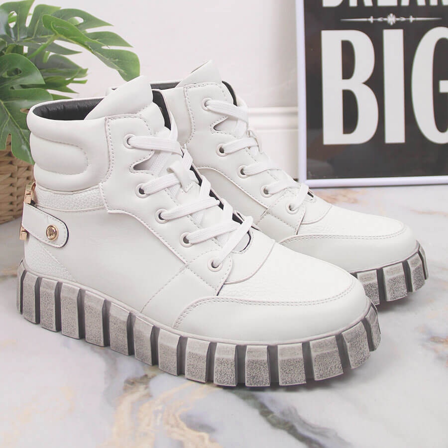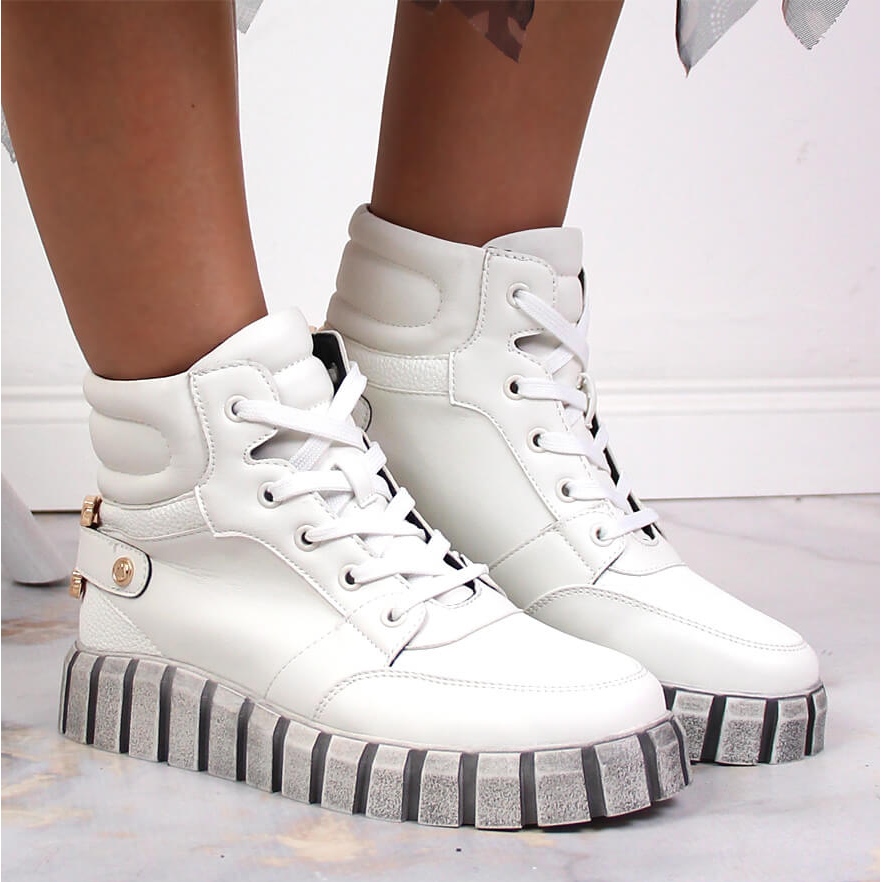 Partea exterioară este din piele ecologică într-o culoare albă elegantă, ceea ce o face să se potrivească perfect în tendințele actuale. Interiorul pantofilor este finisat cu un coc de pantofi si o haina din piele de oaie, care asigura o senzatie placuta de caldura si confort la purtare chiar si in zilele mai reci. Înălțimea căptușei este de aproximativ 11 cm, ceea ce adaugă caracter și subliniază subtil linia gleznei.