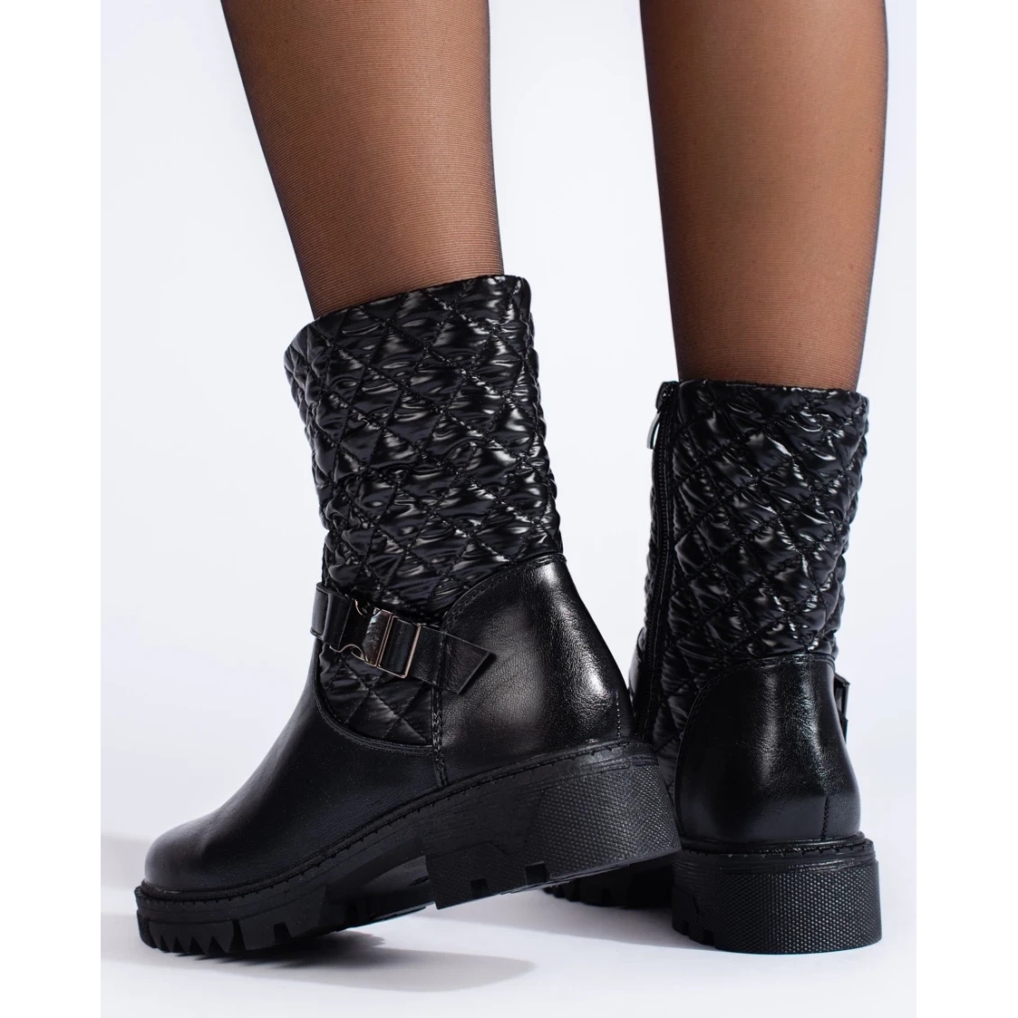 Vă prezentăm îmbrăcăminte de lucru matlasată de damă într-o culoare neagră elegantă, care îmbină confortul și stilul. Confectionate din piele ecologica, aceste cizme sunt perfecte pentru stilul de zi cu zi, adaugandu-le un caracter rock.