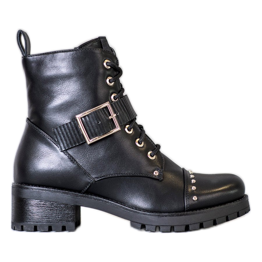 Acești pantofi se caracterizează prin șireturi interesante în față și un fermoar practic în lateral, care facilitează încălțarea și scoaterea pantofilor. În plus, o curea decorativă cu cataramă și strasuri adaugă un accent rock stilului, perfect pentru femeile cărora le place să iasă în evidență din mulțime.