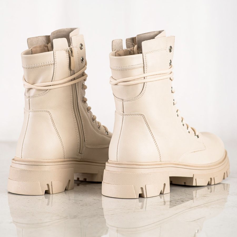 Faceți cunoștință cu Lace-up Workers din Eco Leather în bej de la brandul Bestelle - alegerea perfectă pentru femeile care caută pantofi de zi cu zi eleganti și confortabili. Aceste botine de damă combină stilul casual și rock, ceea ce le face să se potrivească perfect atât cu blugii, cât și cu rochiile.
