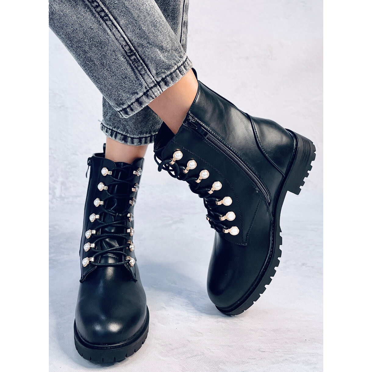 Muncitori cu perle negre strălucitoare - cizme de femei negre, din dantelă - Cizme pentru femei pe un protector care combină moda cu confortul. Tăierea clasică, atemporală, în Universal Black, este decorată cu perle și strasuri subtile, datorită cărora pantofii sunt excelenți atât pentru stilizări de zi cu zi, cât și pentru mai multe aspecte de ieșire.