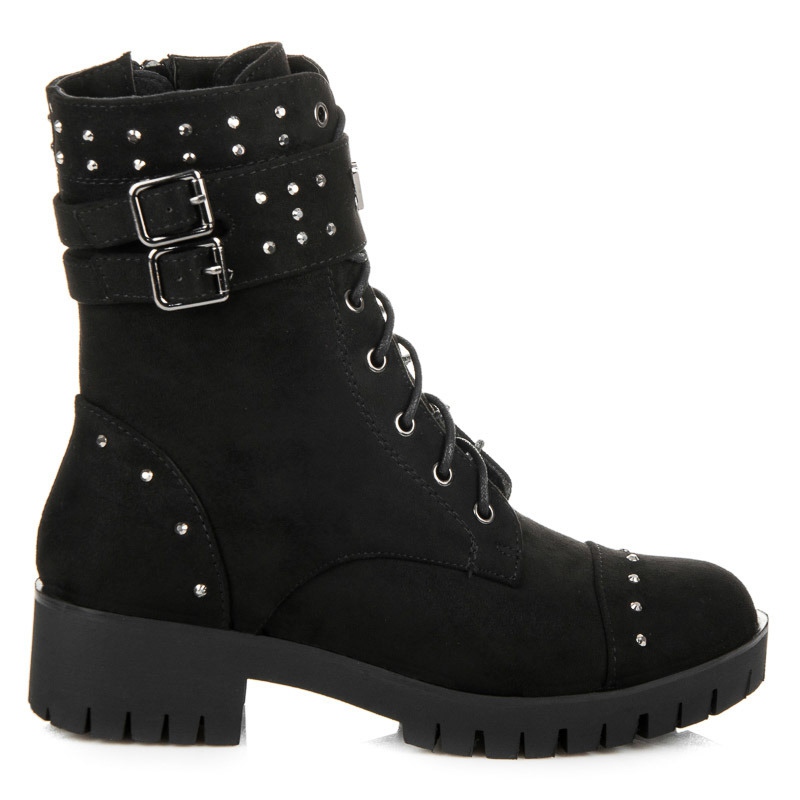 Lucrătorii nu sunt doar stilați, ci și funcționali. Inaltimea care ajunge deasupra gleznei ofera un suport adecvat, iar folosirea din piele intoarsa ecologica le face placut la purtare. Strasurile decorative și două curele cu catarame le subliniază caracterul unic, atrăgând atenția și adăugând originalitate.