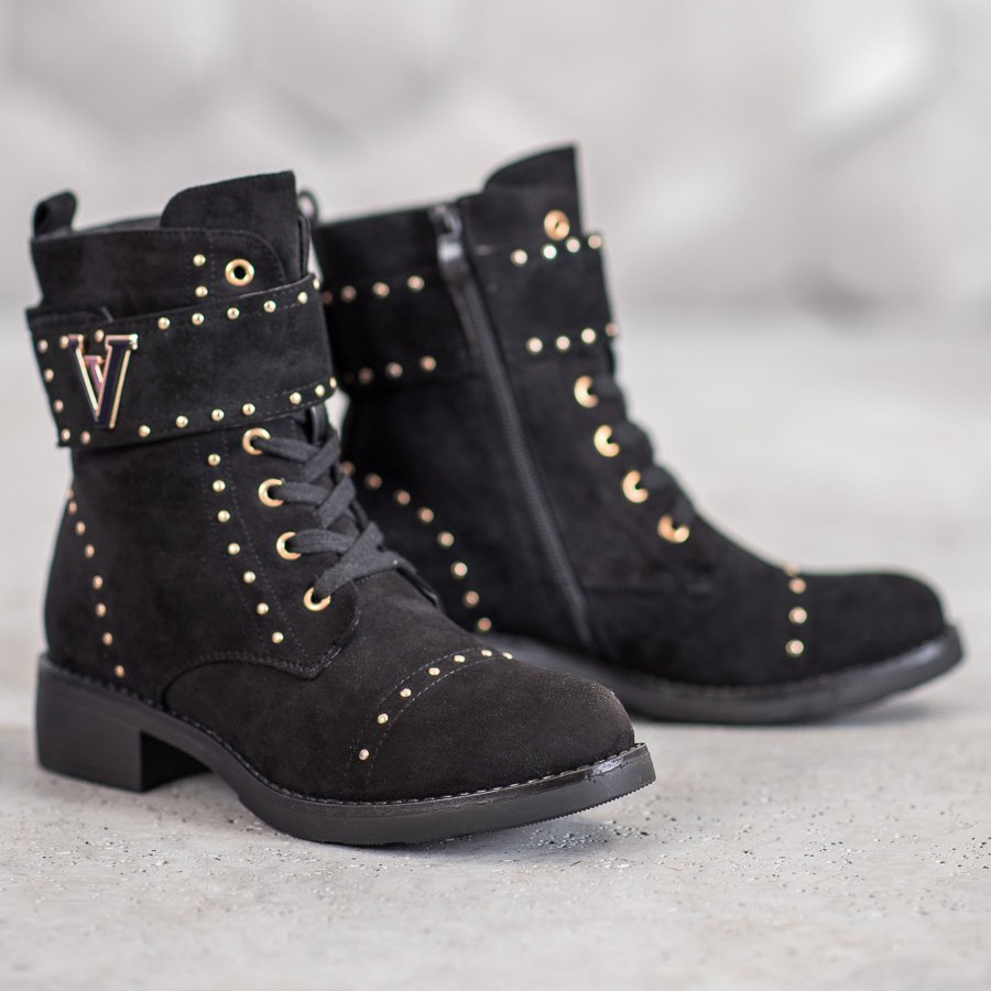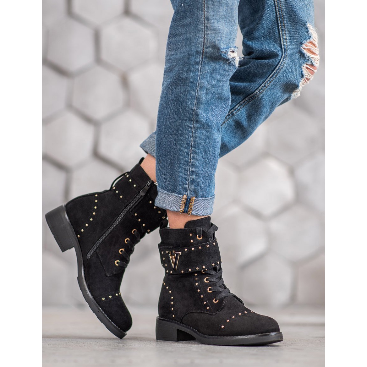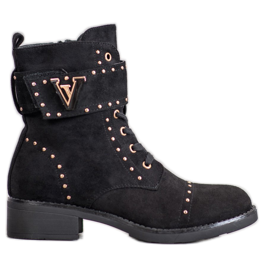 Aceste botine elegante de damă sunt realizate exact din material negru de înaltă calitate, asemănător pielii, care imită pielea de căprioară. Estetica și detaliile merg mână în mână cu funcționalitatea - pe suprafața pantofilor, atenția este atrasă asupra strasurilor aurii la modă aranjate într-un model interesant, adăugând caracter oricărui stil.