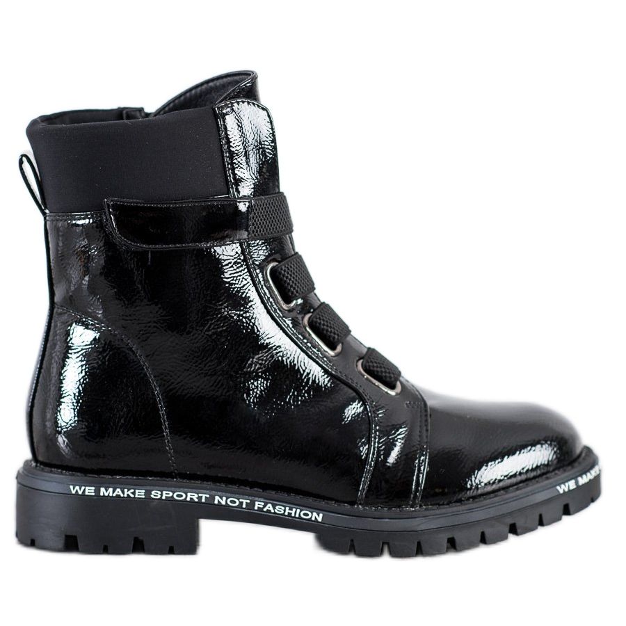 Muncitorii sunt confecționați din piele ecologică de înaltă calitate, ceea ce le conferă un efect elegant de brevet. Interiorul pantofilor este izolat, ceea ce îi face o alegere excelentă pentru zilele mai reci. Partea superioară până la gleznă și vârful rotund asigură confort și libertate de mișcare.
