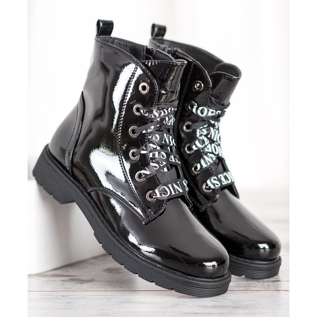 Descoperiți stilul și confortul de neegalat cu lucrătorii lăcuți VINCEZA într-o culoare clasică neagră. Aceste cizme bovver la modă create cu gândul la femei sunt alegerea perfectă pentru fiecare zi, mai ales în sezonul toamnă/iarnă. Datorită finisajului elegant lăcuit, te vei remarca în mulțime, combinând stilul casual și rock.