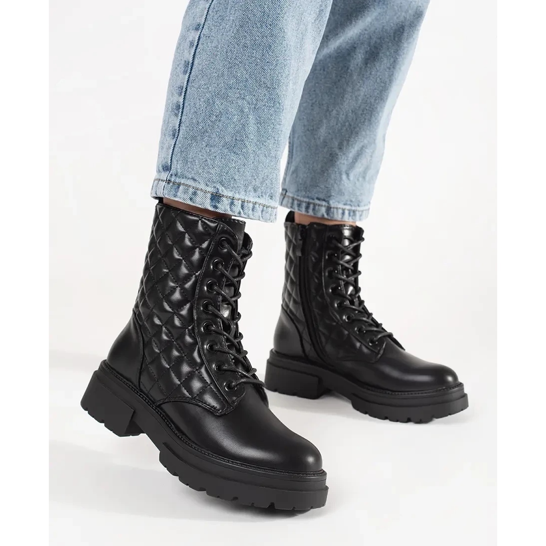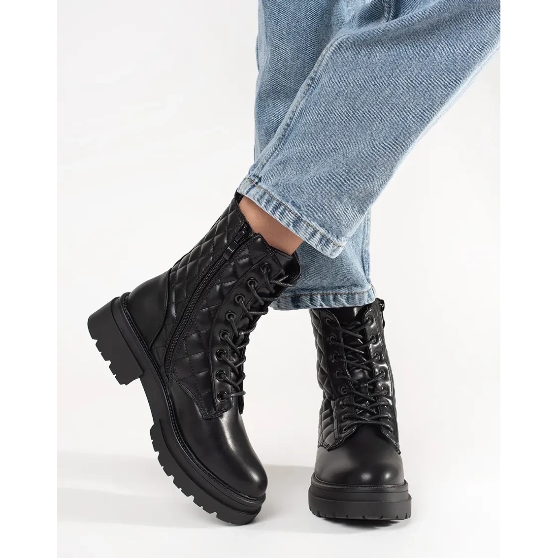 Supertul portierului este construit -up, care asigură stabilitatea piciorului și, în același timp, adaugă eleganță întregii stilizări. Înălțimea superiorului de 19 cm înseamnă că muncitorii ajung la gleznă, care va fi perfectă în zile mai răcoroase. Pielea ecologică neagră, matlasată este un material care nu este doar ecologic, ci și ușor de îngrijit, ceea ce le face o alegere practică în fiecare zi.