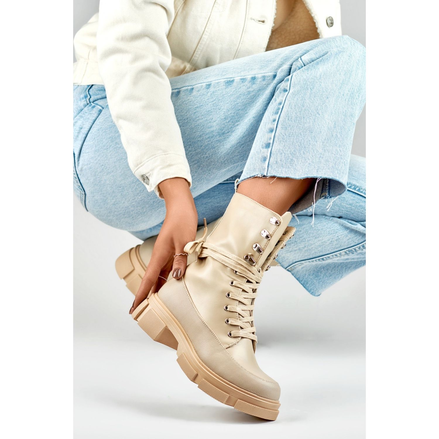 Acești muncitori vor fi un complement perfect pentru multe stilizări de toamnă și de iarnă - atât casual, cât și mai elegant. Culoarea bej face ca pantofii să fie ușor de combinat cu îmbrăcăminte diferită, adăugând caracter la fiecare stilizare.