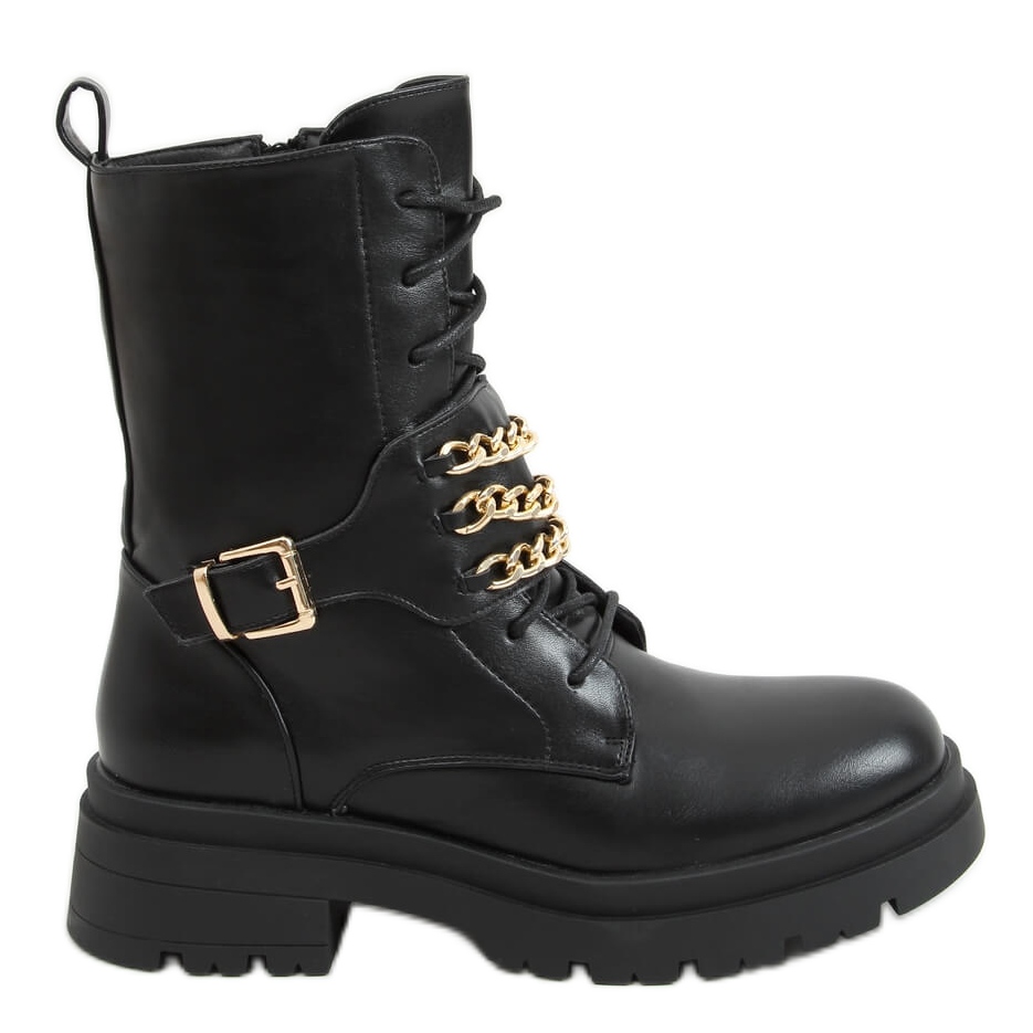 Vă prezentăm NC1227 Cizme de muncitori negre cu lanțuri - cizme perfecte pentru femeile care prețuiesc un aspect la modă și confortul de zi cu zi. Aceste botine cu siret se remarca nu doar prin simpla lor, ci si prin designul lor impresionant, care atrage atentia datorita lanțurilor aurii amplasate in fata. Înălțimea largă a tocului de 5 cm asigură un confort optim la purtare, iar culoarea clasică neagră face ca acest model să se potrivească perfect cu o varietate de stiluri.