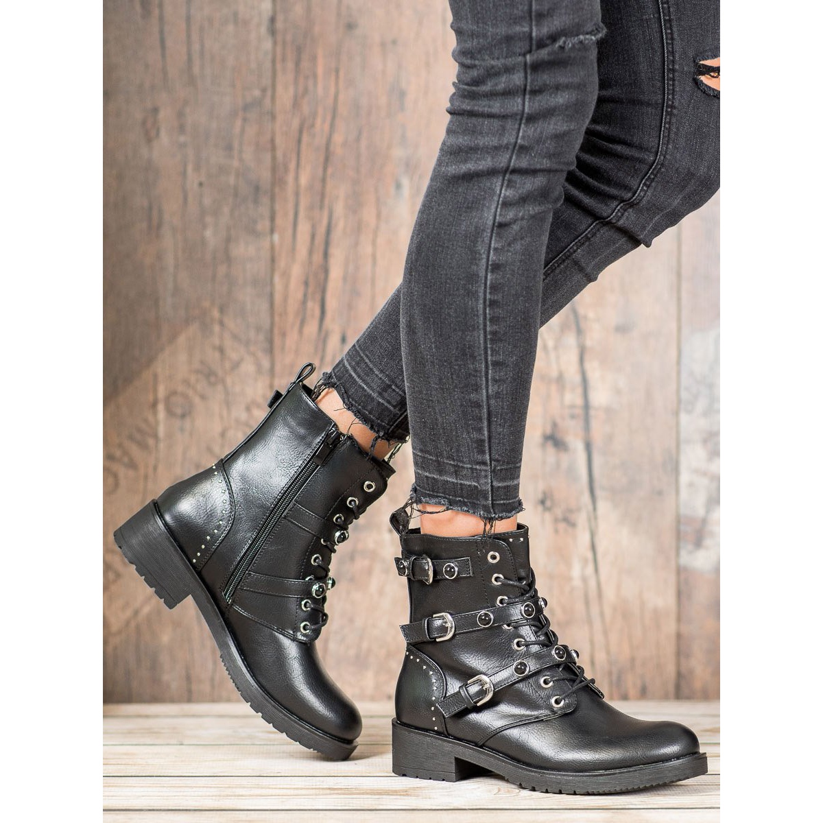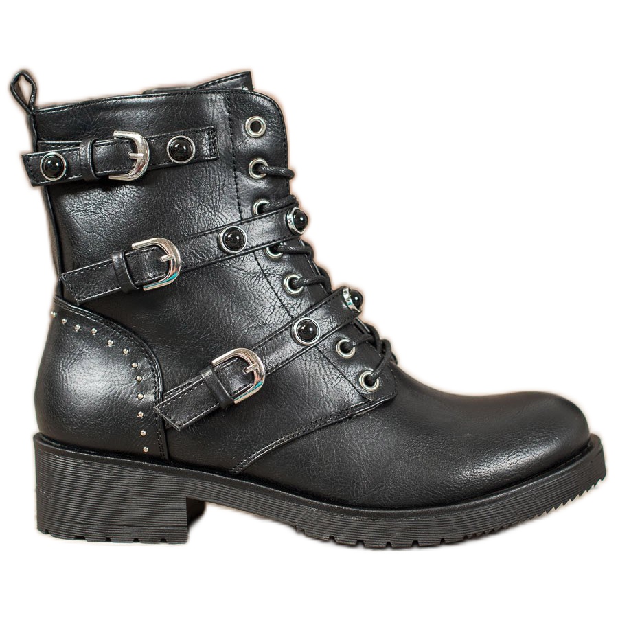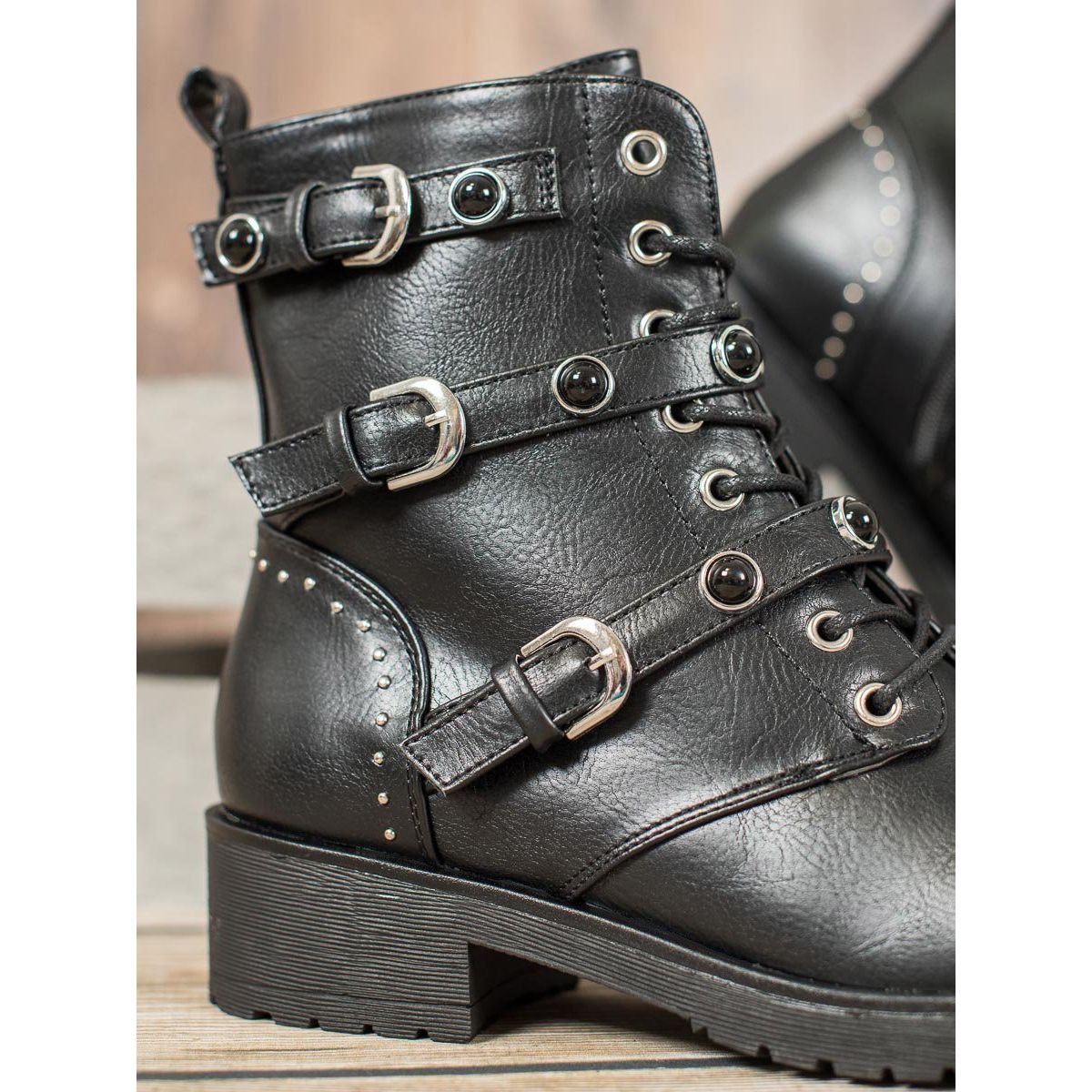 Aceste cizme unice au șireturi în față și fermoare în interior, ceea ce le face ușor de pus și de scos. În plus, curelele decorative cu catarame și strasuri le adaugă un caracter rock, făcându-le un accent la modă pentru orice stil.