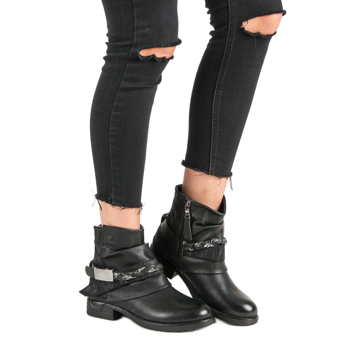 Acest model se distinge nu numai prin funcționalitate, ci și prin designul său original. Partea superioară a pantofilor este îmbogățită cu diverse texturi de piele, ceea ce le conferă un caracter unic. Un avantaj suplimentar este o curea elegantă cu împletitură cu cataramă decorativă, care subliniază estetica rock. Un toc plat de 3 cm inalt ii face pe muncitori extrem de confortabili in timpul utilizarii, perfect pentru coafarea de zi cu zi.