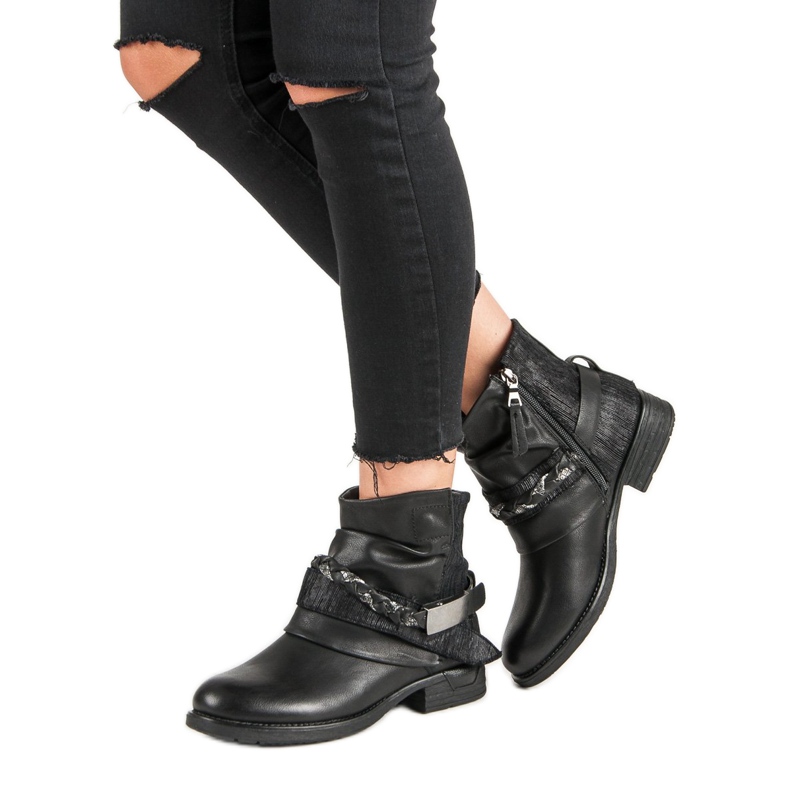 Cizmele de lucru negre de damă sunt un must-have în fiecare garderobă, mai ales pentru iubitorii stilului rock. Realizate din piele ecologica de inalta calitate, arata elegant si sunt prietenoase cu mediul. Partea superioară a acestora, ajungând deasupra gleznei, protejează perfect de frigul zilelor de toamnă și iarnă, iar izolația inovatoare cu o pătură de pantofi asigură confort termic chiar și în zilele mai reci.