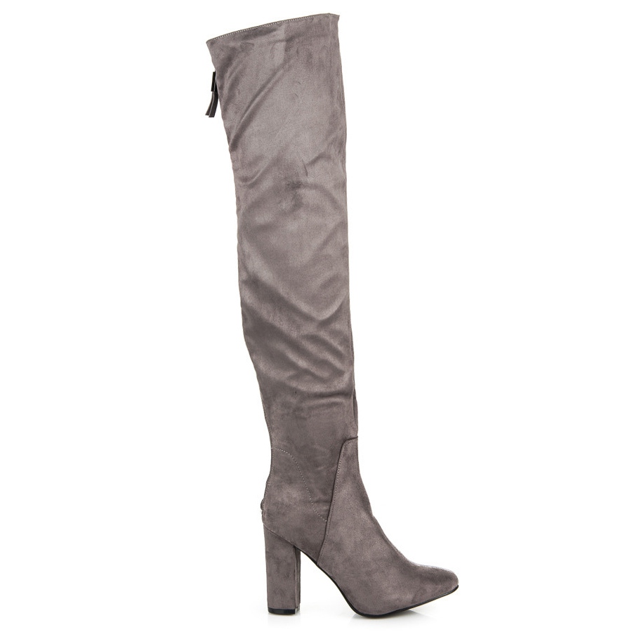 Pantofii sunt confectionati din piele intoarsa ecologica de inalta calitate, care garanteaza confort si durabilitate la purtare. Un toc stabil de 10 cm inalt si o talpa sintetica neteda asigura confort si in acelasi timp modeleaza optim silueta, slabind picioarele si subliniind avantajele acestora. Partea superioară înaltă, ajungând deasupra genunchiului, adaugă caracter și eleganță, iar vârful migdalată introduce o notă subtilă de clasicitate.