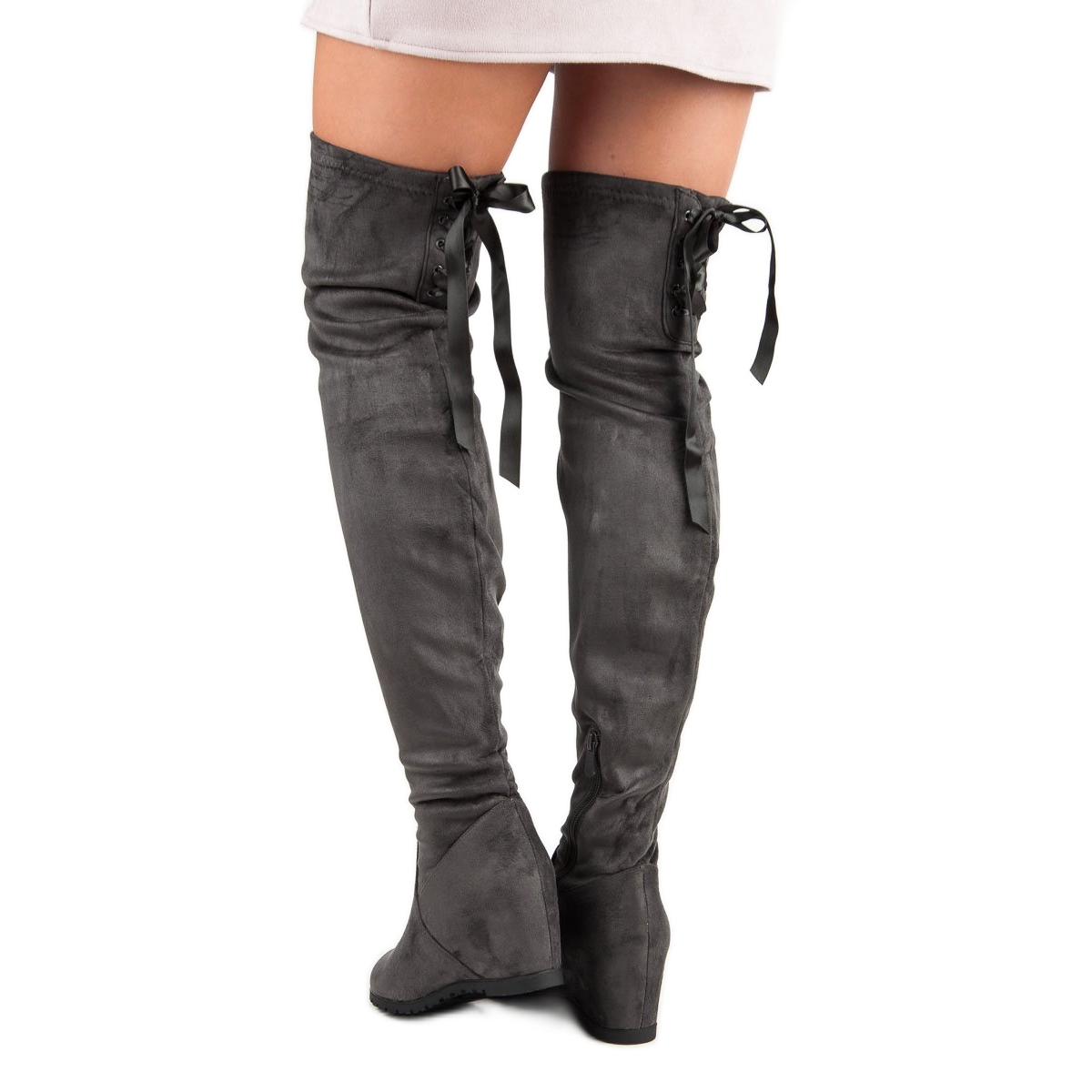 Cizmele peste genunchi cu piele intoarsa ecologica intr-o nuanta eleganta de gri sunt un plus perfect pentru orice garderoba. Partea superioară înaltă, deasupra genunchiului, nu numai că adaugă caracter, ci și protejează eficient împotriva frigului. Fermoarul și șireturile extrem de practice permit o potrivire perfectă și o îmbrăcare ușoară.