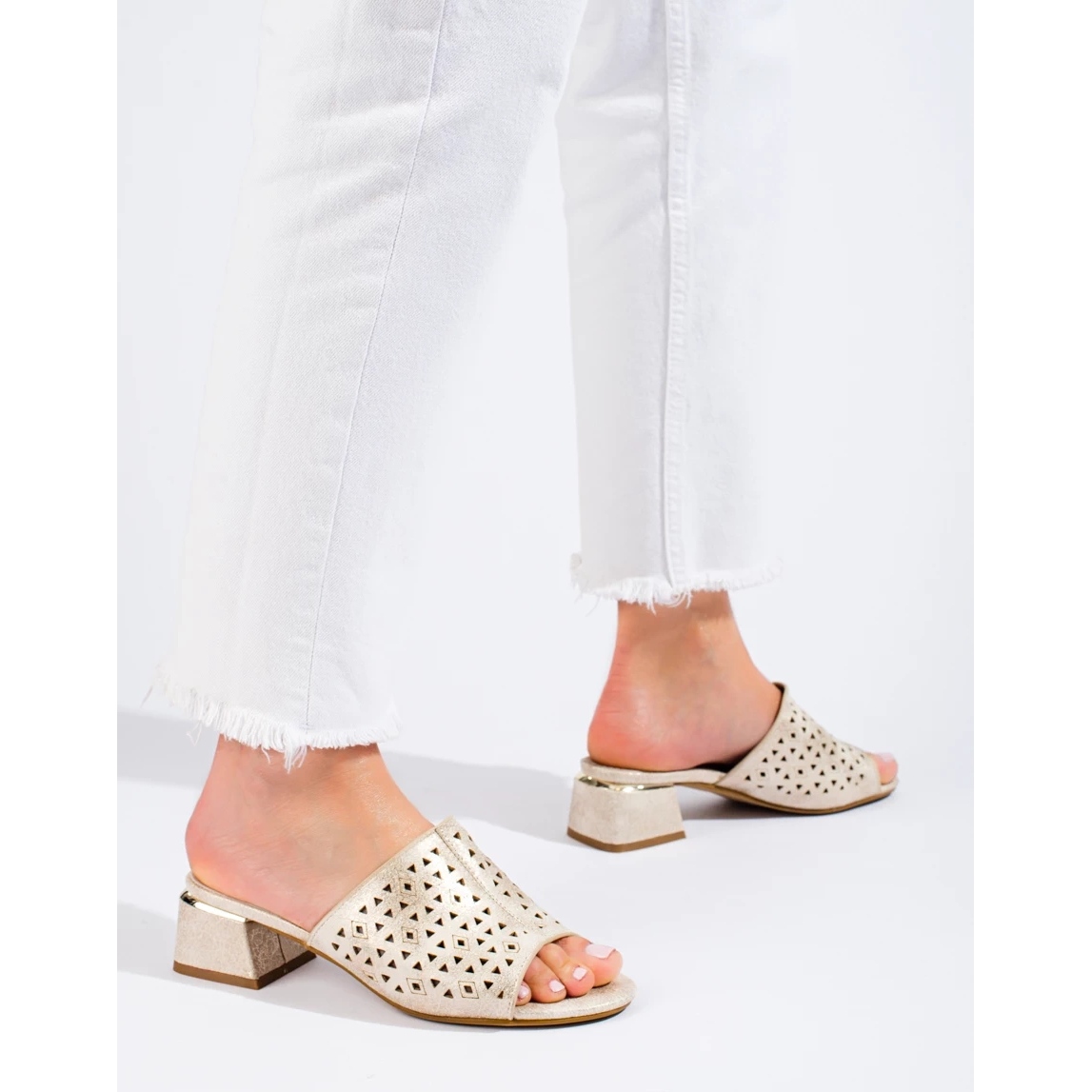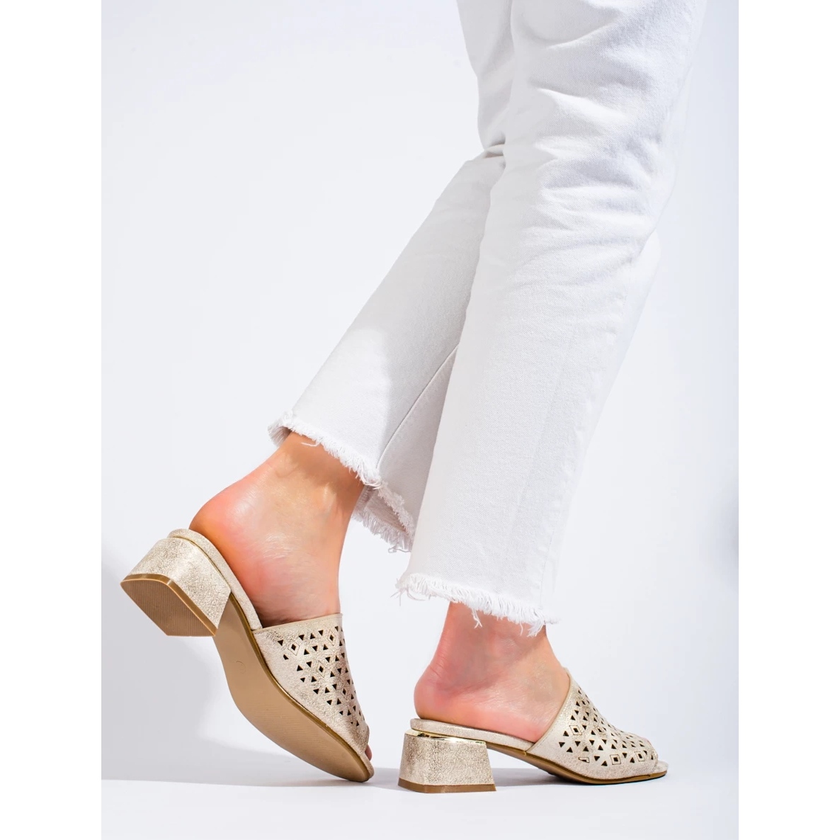 Elegant și confortabil - așa puteți descrie pe scurt șlapii aurii ajurati cu toc mic de la SHELOVET. Acest model atemporal este alegerea perfectă pentru femeile care prețuiesc eleganța și confortul la fiecare pas. Flip-flops au fost concepute pentru utilizarea de zi cu zi, iar universalitatea lor le face perfecte atât pentru plimbările de vară, cât și pentru zilele de primăvară sau toamnă.