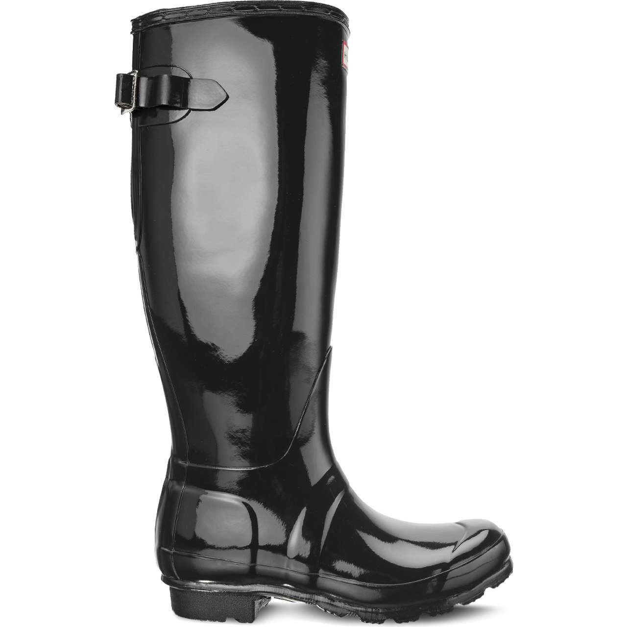 Hunter Original Back Adjustable Gloss Black - cizme de ploaie emblematice, strălucitoare pentru femei, care combină o icoană de stil cu caracterul practic de zi cu zi. Realizate manual din cauciuc vulcanizat cu un finisaj lucios, atrag atentia prin designul lor minimalist si manopera solida. Cureaua reglabilă din spate vă permite să ajustați partea superioară la gambe, asigurând o mai bună stabilizare și confort la purtare.