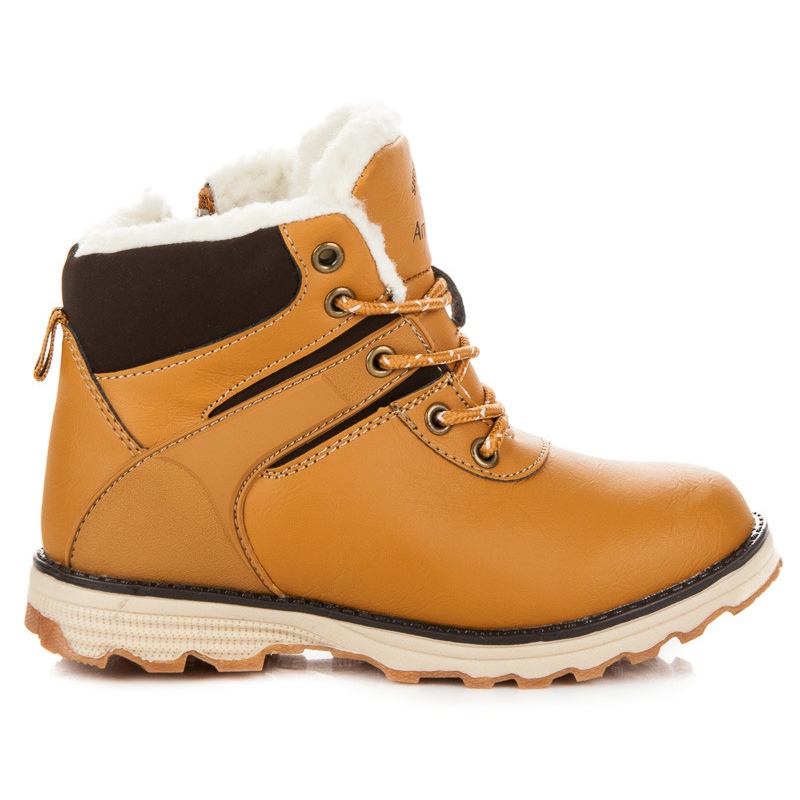 Perfecte pentru zilele mai friguroase, cizme de drumetie pentru copii din piele ecologica, izolate cu o haina moale din piele de oaie. Finisajul clasic maro și bej cu o inserție mai închisă în partea de sus le conferă un caracter universal, casual - perfect pentru utilizarea de zi cu zi în sezonul toamnă/iarnă.