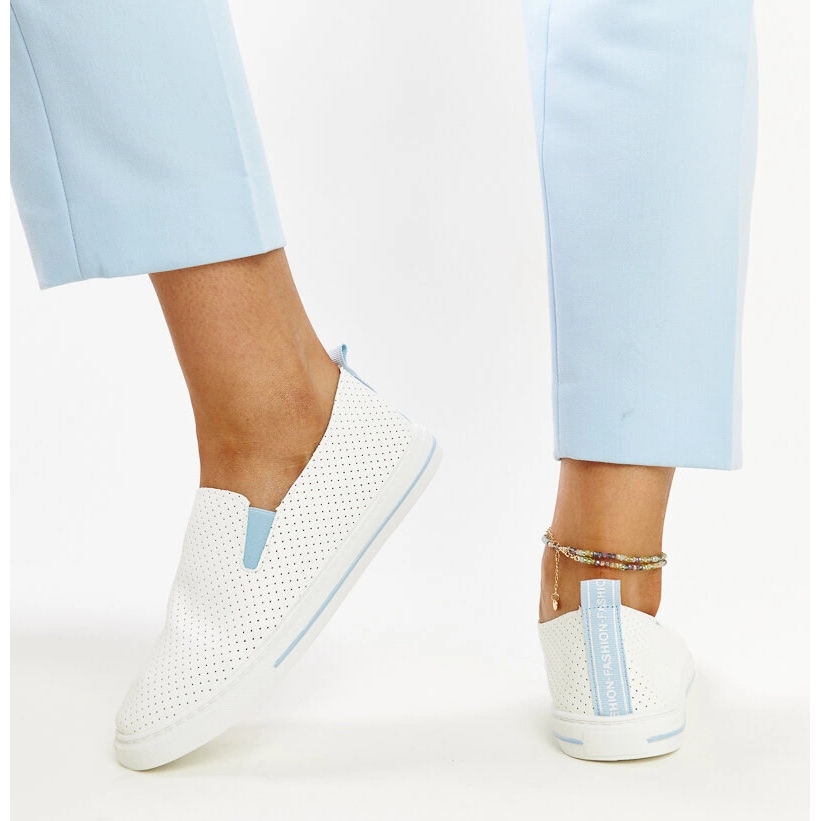 Confortul purtării este subliniat suplimentar de designul slip-on, care facilitează încălțarea și scoaterea rapidă a pantofilor, integrându-se în stilul de viață rapid al femeilor moderne. Pantofii albi se concentrează pe simplitate, care, combinată cu un accent suplimentar de culoare, care este o nuanță delicată de albastru, le conferă un caracter unic.