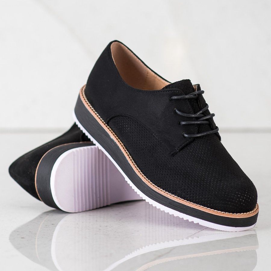 Pantofii au o platforma solida de 3 centimetri cu talpa calata, care asigura o buna aderenta si stabilitate pe diverse suprafete. Partea din față ajurata a pantofilor, decorată cu găuri delicate, le conferă un caracter unic și originalitate. Închiderea cu dantelă permite o ajustare precisă a piciorului, asigurând confortul de purtare pe tot parcursul zilei.