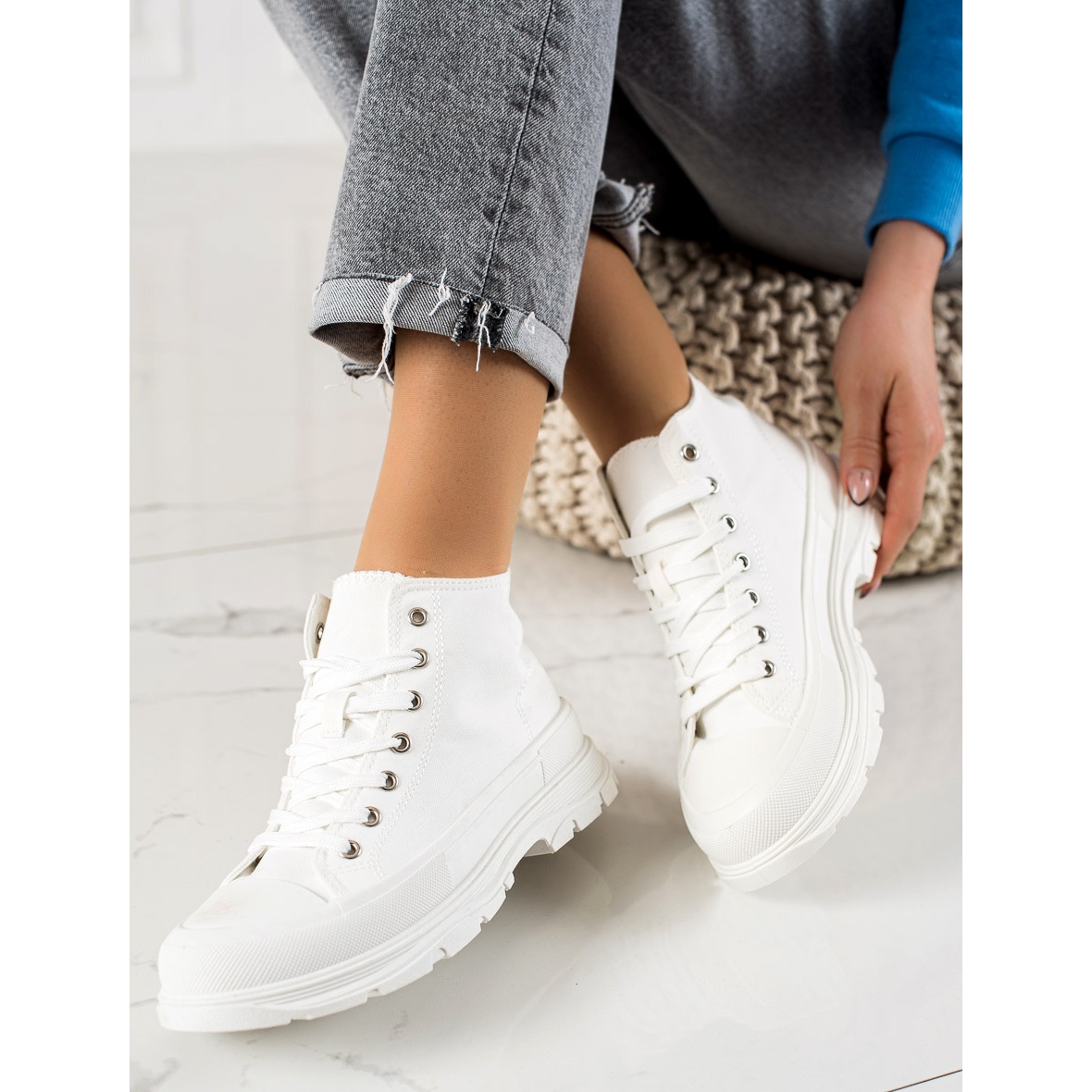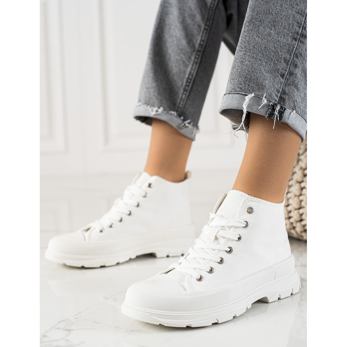 Descoperă combinația perfectă de stil și confort cu adidașii cu platformă de la TRENDI! Acești adidași albi de damă sunt o alegere perfectă pentru orice ocazie, combinând ușurința sportivă cu casual chic. Datorită călcâiului moale, încorporat și materialului textil flexibil, mersul în ele este atât convenabil, cât și confortabil.