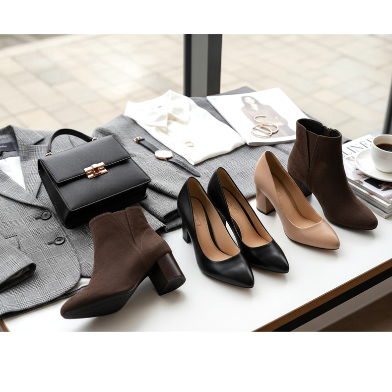 Soluția perfectă vor fi pompele cu toc bloc sau toc stiletto. Alegeți modele în culori discrete - negru, bej sau maro. Amintiți-vă că un costum este o ținută clasică, așa că tocurile înalte vor ajuta la menținerea proporțiilor corecte ale siluetei tale și vor face ca întregul stil să arate armonios și profesionist.