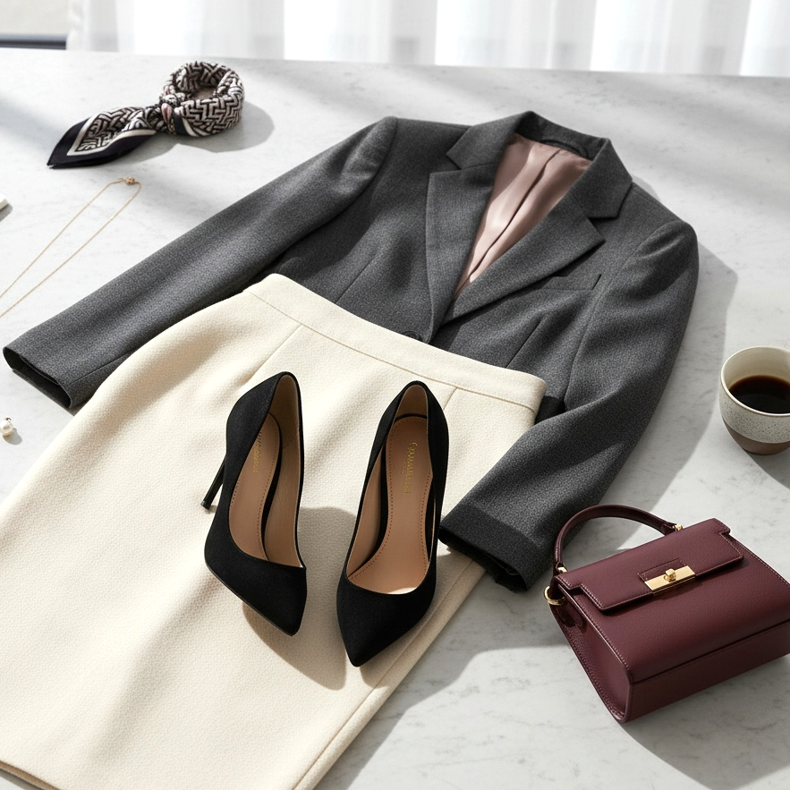 Un costum este o alegere excelentă pentru birou, atâta timp cât îl aranjați corespunzător. Pantofii eleganti cu toc inalt sunt cei mai buni pentru lucru, deoarece iti vor prelungi optic picioarele si vor adauga gratie siluetei tale.