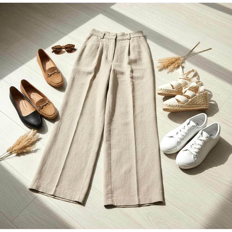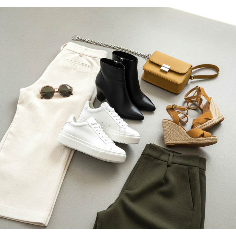 Primăvara și vara, poți purta și sandale cu pană sau espadrile cu pantaloni largi. Acești pantofi vor adăuga un caracter de vară ținutei tale și, în același timp, vor arăta la modă și stilat. Modelele cu cravate sau decorațiuni atrăgătoare vor funcționa deosebit de bine.