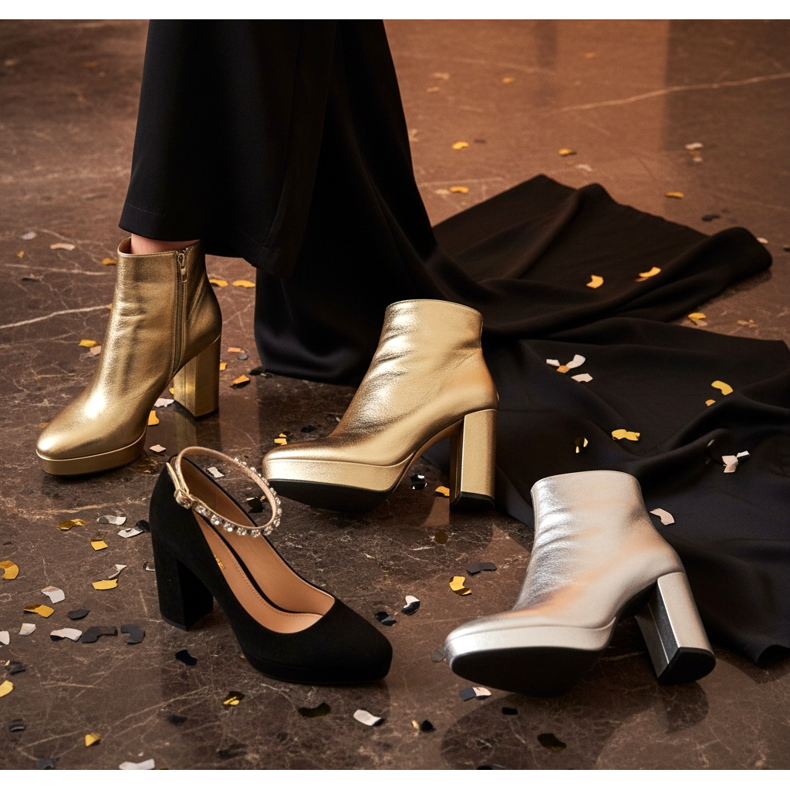 Soluția perfectă va fi tocuri înalte în culori discrete pe care le poți asorta cu restul ținutei tale. Dacă mergi la o petrecere de seară, poți alege modele cu decorațiuni atrăgătoare – de exemplu, cu cristale sau accente metalice.