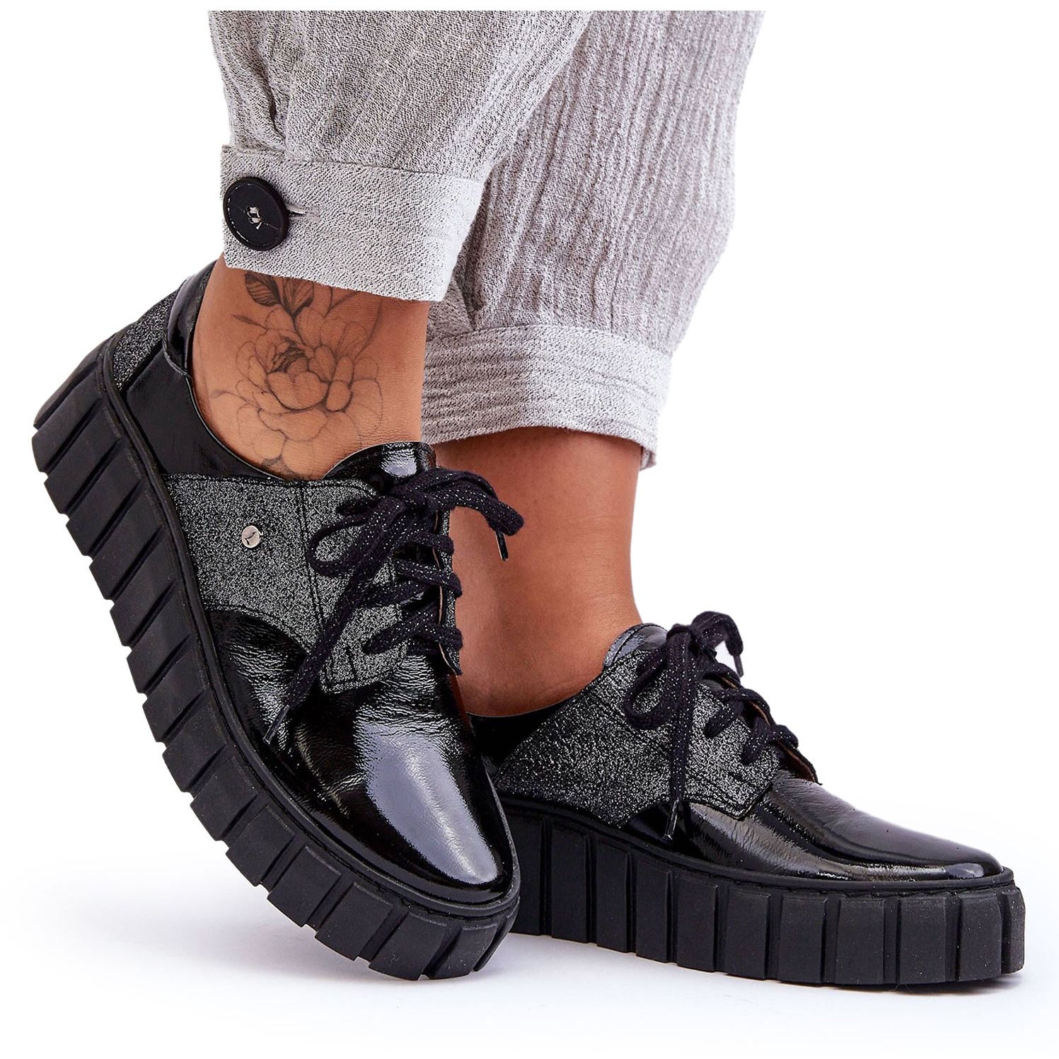 Încălțăminte elegantă și modernă pentru femei de la Lemar, care combină confortul de a purta cu un aspect la modă și expresiv. Partea superioară din piele naturală lucioasă (pour negru) cu accent sclipitor, șireturi decorate cu fir strălucitor și o platformă masivă, hrănită (4,5 cm), creează un model universală eficient și, în același timp, ideal pentru sezonul de toamnă/iarnă.