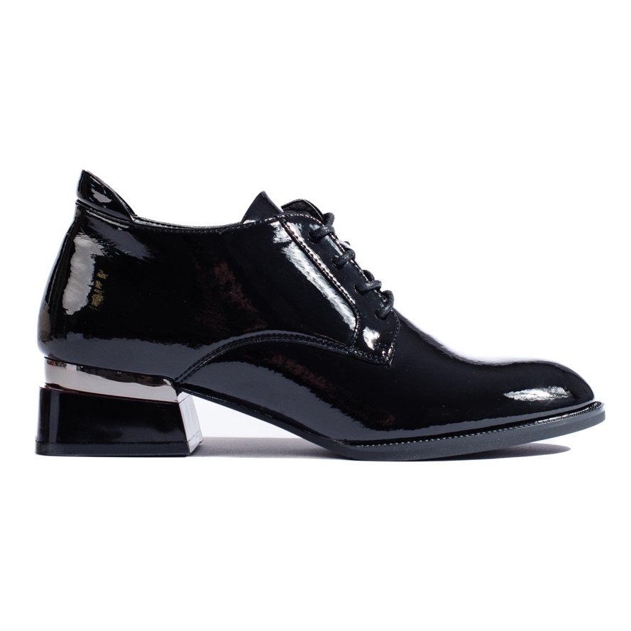 Pantofii cu șireturi cu toc înalt lăcuiți negru Vinceza sunt sinonimi cu eleganța într-o formă confortabilă, perfect pentru femeile moderne care apreciază designul atemporal și funcționalitatea într-unul.