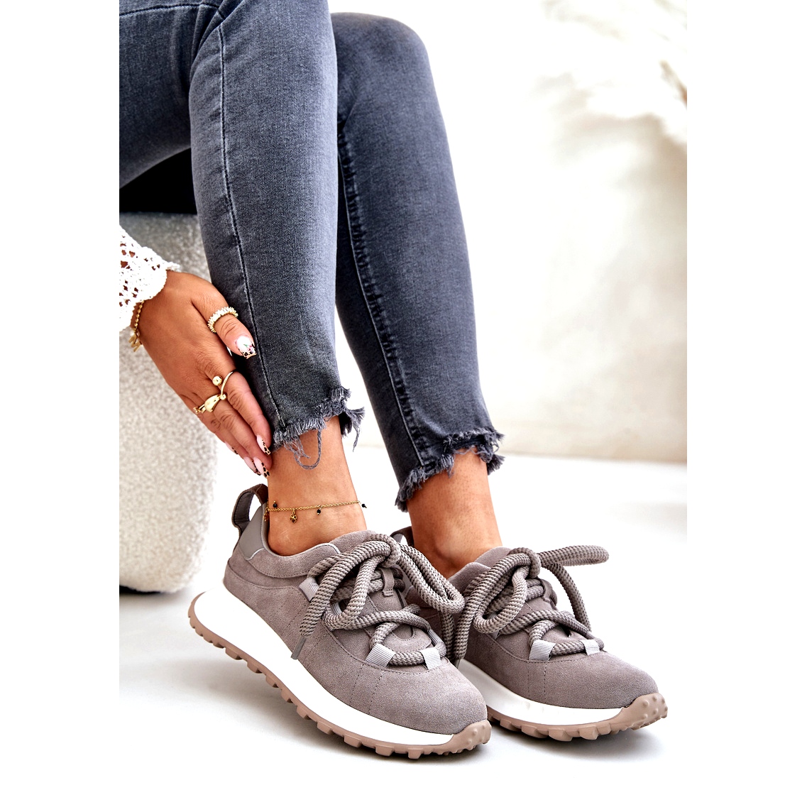Adidașii din piele de căprioară pentru femei, cu artiker de dantelă groasă 54C1465, într -o nuanță gri la modă, este alegerea perfectă pentru fiecare femeie modernă care apreciază confortul și stilul. Aceste adidași unici sunt din piele de căprioară naturală, ceea ce le oferă un caracter elegant și casual.