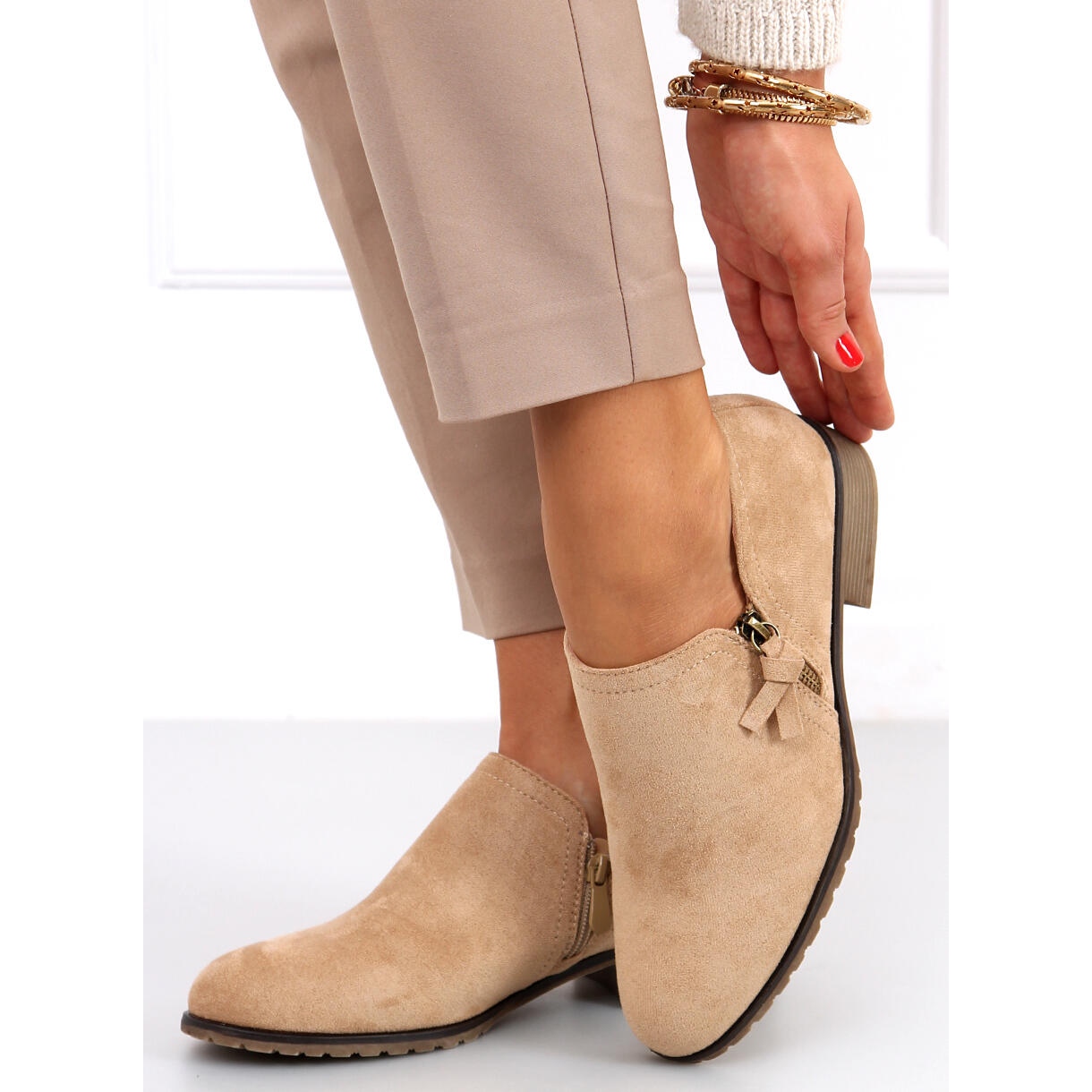 Pantofii de dama Erna in nuante de kaki si bej sunt alegerea perfecta pentru femeile care apreciaza confortul si stilul. Realizate din piele intoarsa ecologica, arata extrem de eleganta, iar forma lor bine formata evidentiaza perfect orice aspect. Acest model se remarca printr-un fermoar practic pe lateral, care face mult mai usor incaltarea si scoaterea pantofilor.