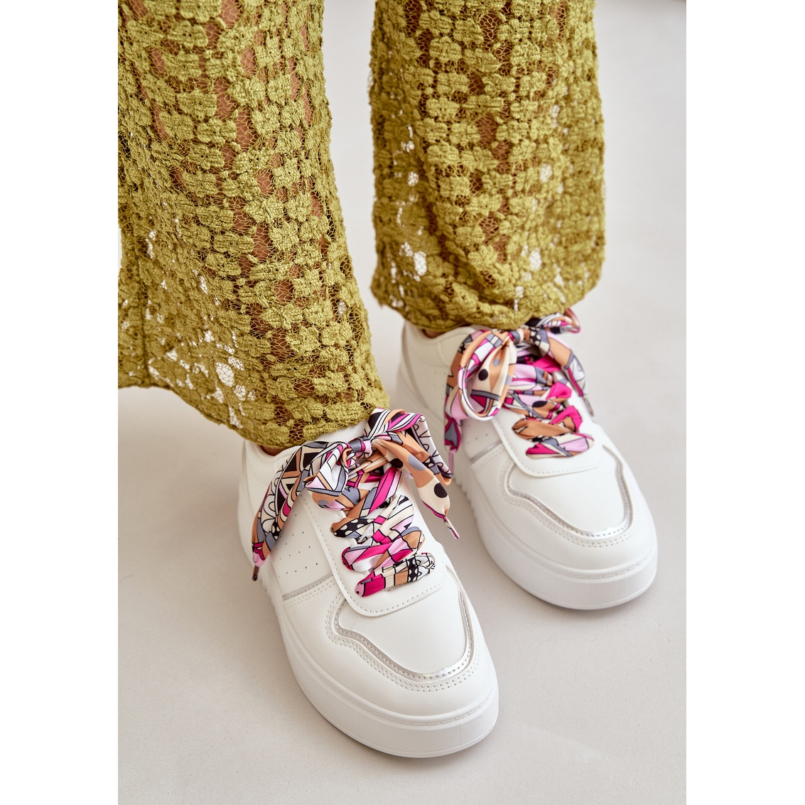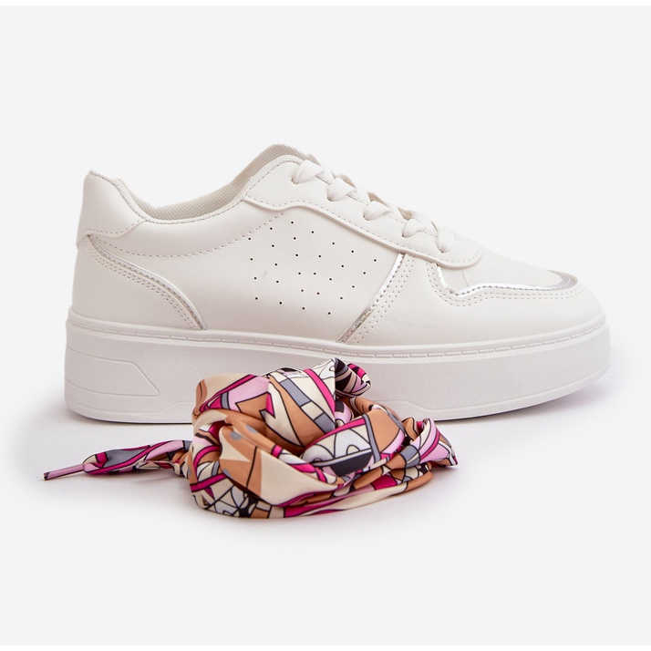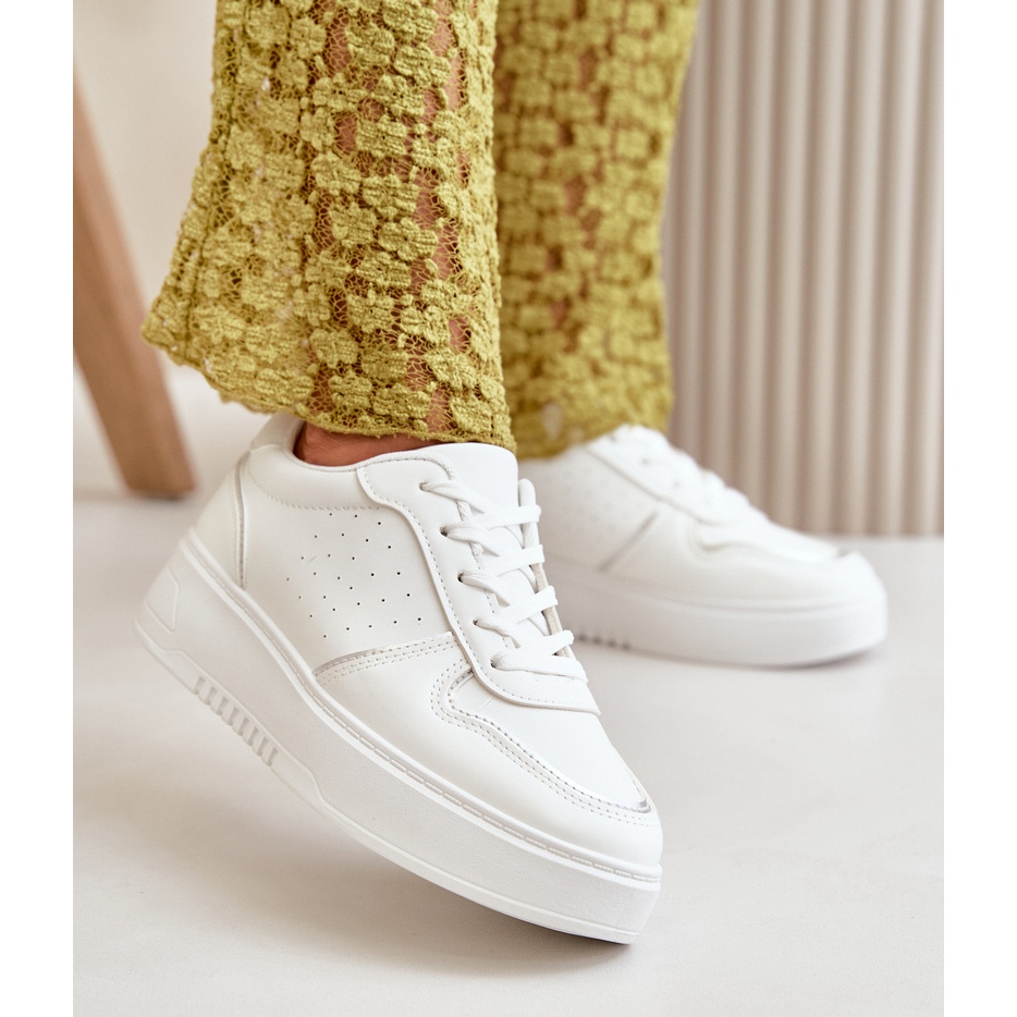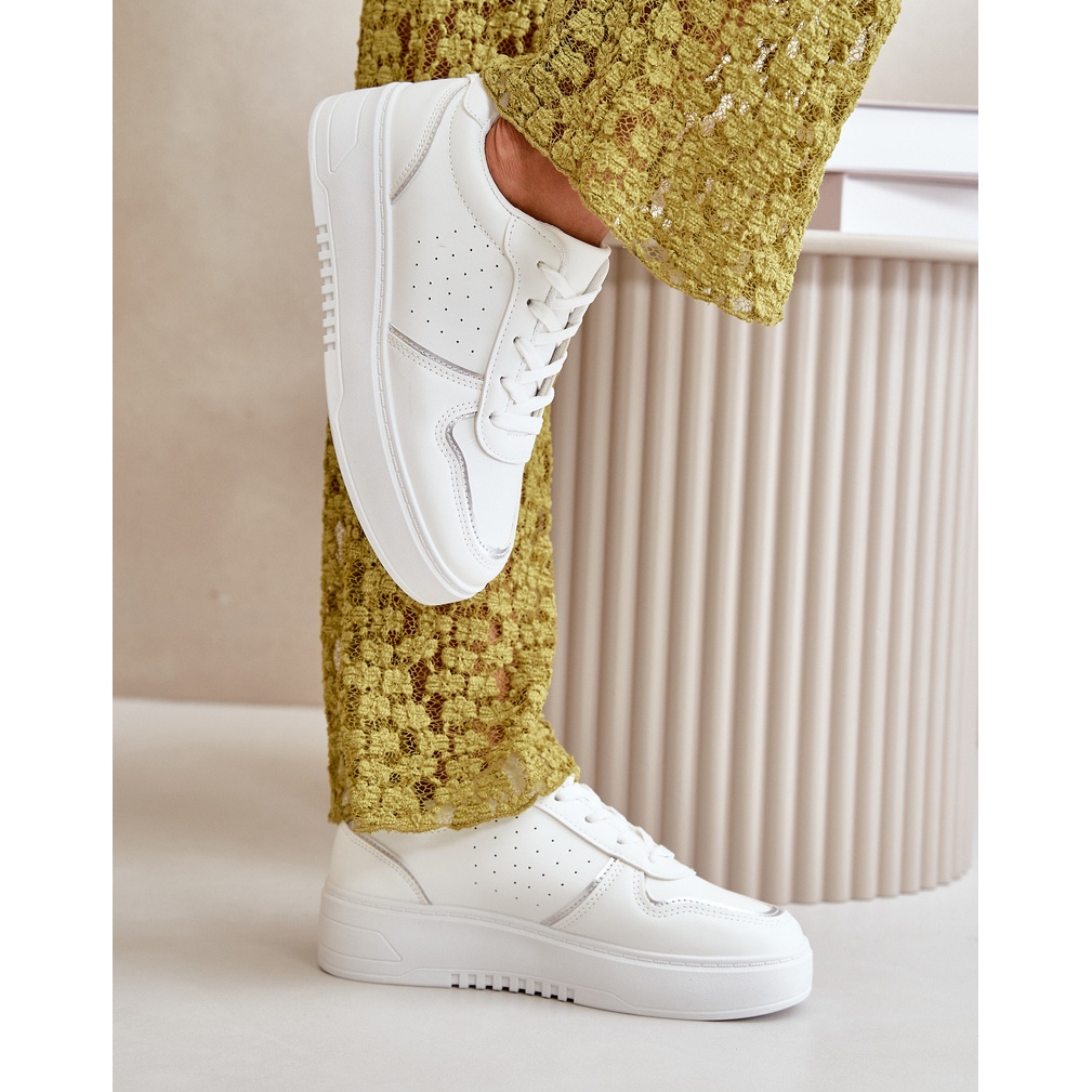 Acești pantofi sunt așezați pe o platformă stabilă cu o înălțime de 3,5 cm, ceea ce nu numai că adaugă ușurință, dar prelungește optic picioarele. Lacicul decorativ suplimentar oferă adidașilor originalitate și îi face să iasă în evidență de alte modele. Culoarea lor albă cu accente subtile multiple, le face să se îmbine bine atât cu ținute casual, cât și mai elegante.