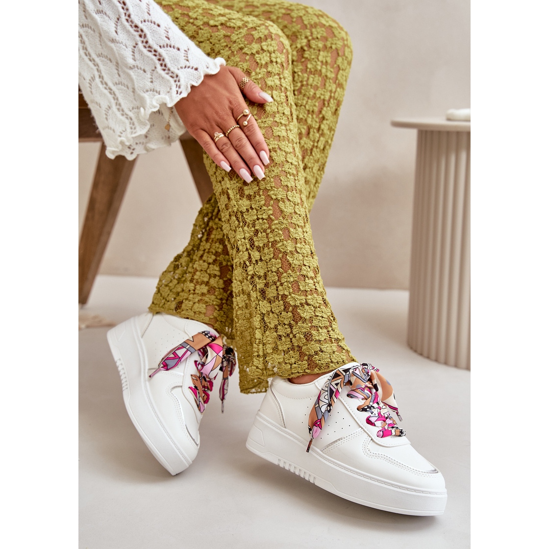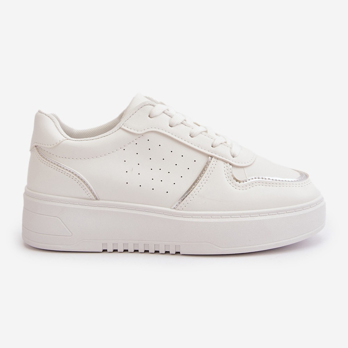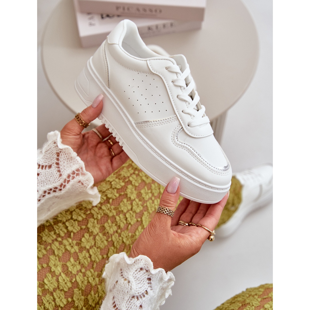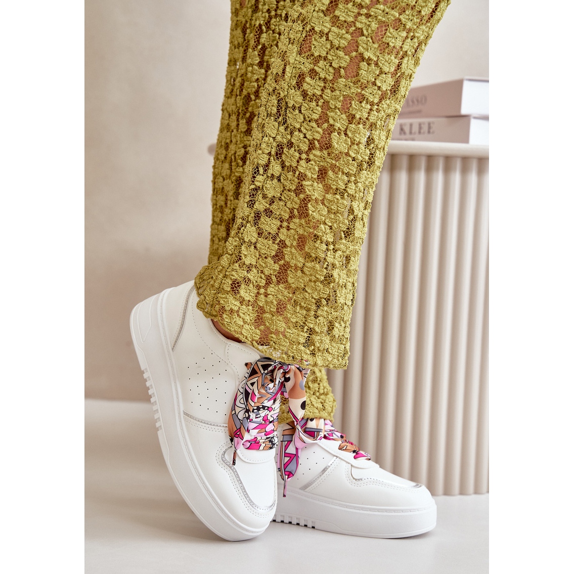Acești pantofi sunt așezați pe o platformă stabilă cu o înălțime de 3,5 cm, ceea ce nu numai că adaugă ușurință, dar prelungește optic picioarele. Lacicul decorativ suplimentar oferă adidașilor originalitate și îi face să iasă în evidență de alte modele. Culoarea lor albă cu accente subtile multiple, le face să se îmbine bine atât cu ținute casual, cât și mai elegante.