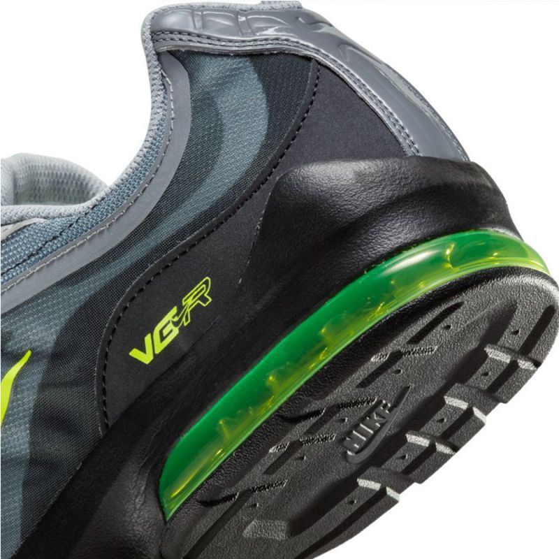 Partea superioară din plasă dintr-o singură fibră asigură o respirabilitate optimă, ceea ce este deosebit de important în timpul antrenamentului intens. Inspirațiile de design ale pantofilor sunt preluate de la modelul Air Max 95, dar Air Max VG-R adaugă o notă modernă, referindu-se la stilul mașinilor de curse. Culoarea gri a pantofilor îi face să se potrivească cu multe stiluri, atât sport, cât și de zi cu zi.