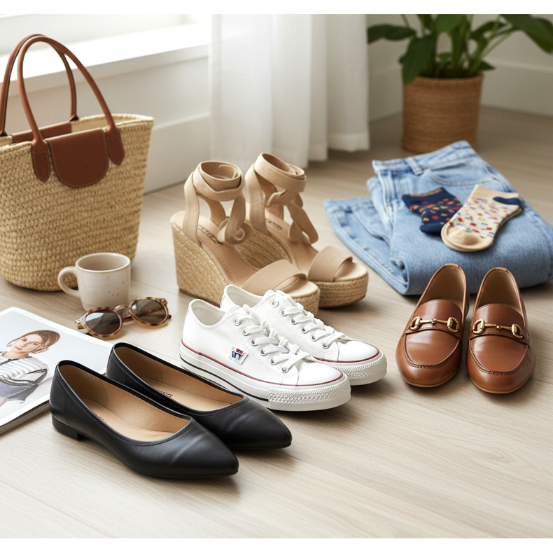 Primăvara și vara, poți purta și sandale cu pană sau espadrile cu blugi mom. Acești pantofi vor adăuga un caracter de vară ținutei tale și, în același timp, vor arăta la modă și stilat. Modelele cu cravate sau decorațiuni atrăgătoare vor funcționa deosebit de bine.