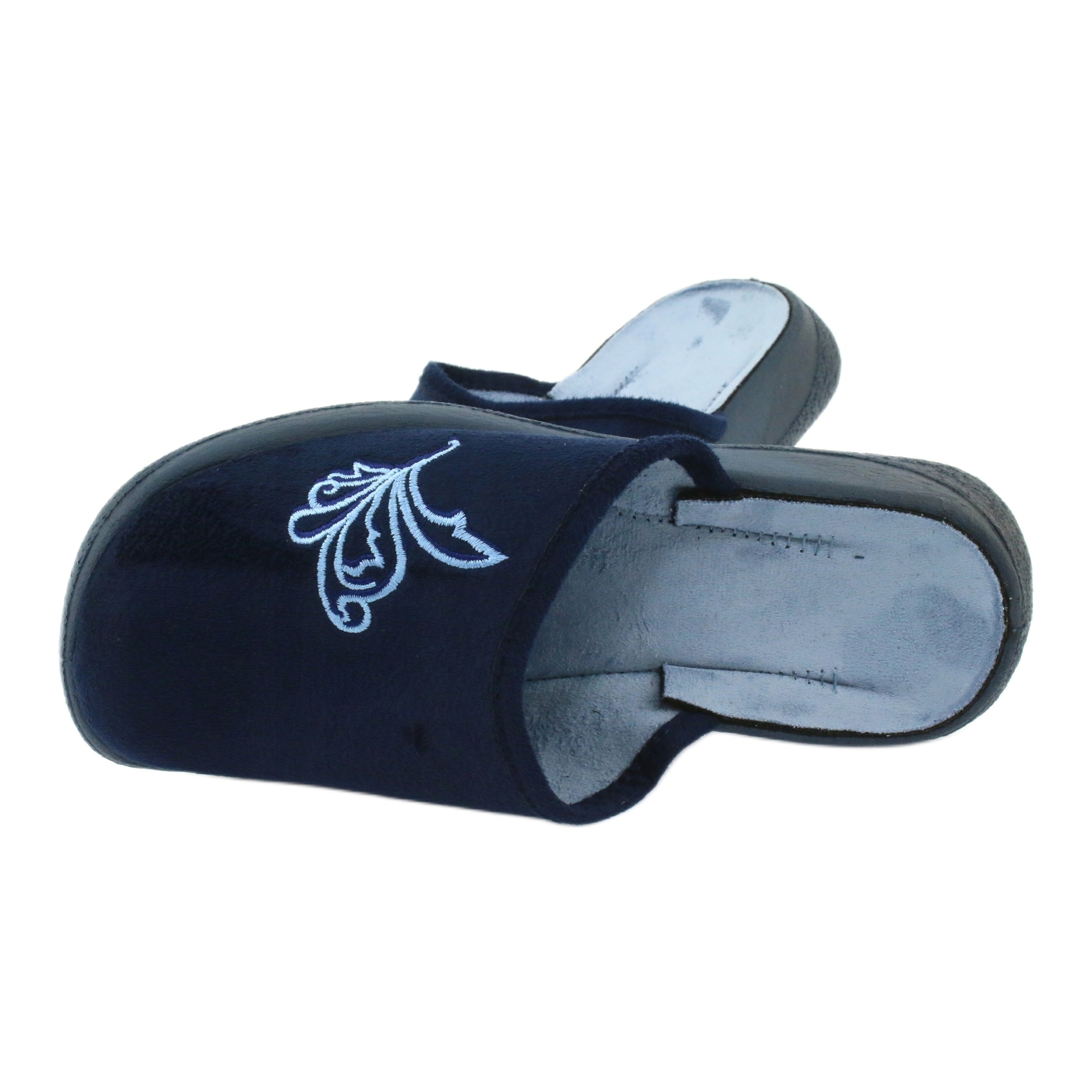 Caracteristica distinctivă a acestor papuci este tălpile flexibile, profilate, care se adaptează perfect formei piciorului, asigurând o senzație de lejeritate și confort pe tot parcursul zilei. Nasul rotund adaugă un accent la modă, iar culoarea subțire bleumarin le face să se potrivească cu multe stiluri de acasă.
