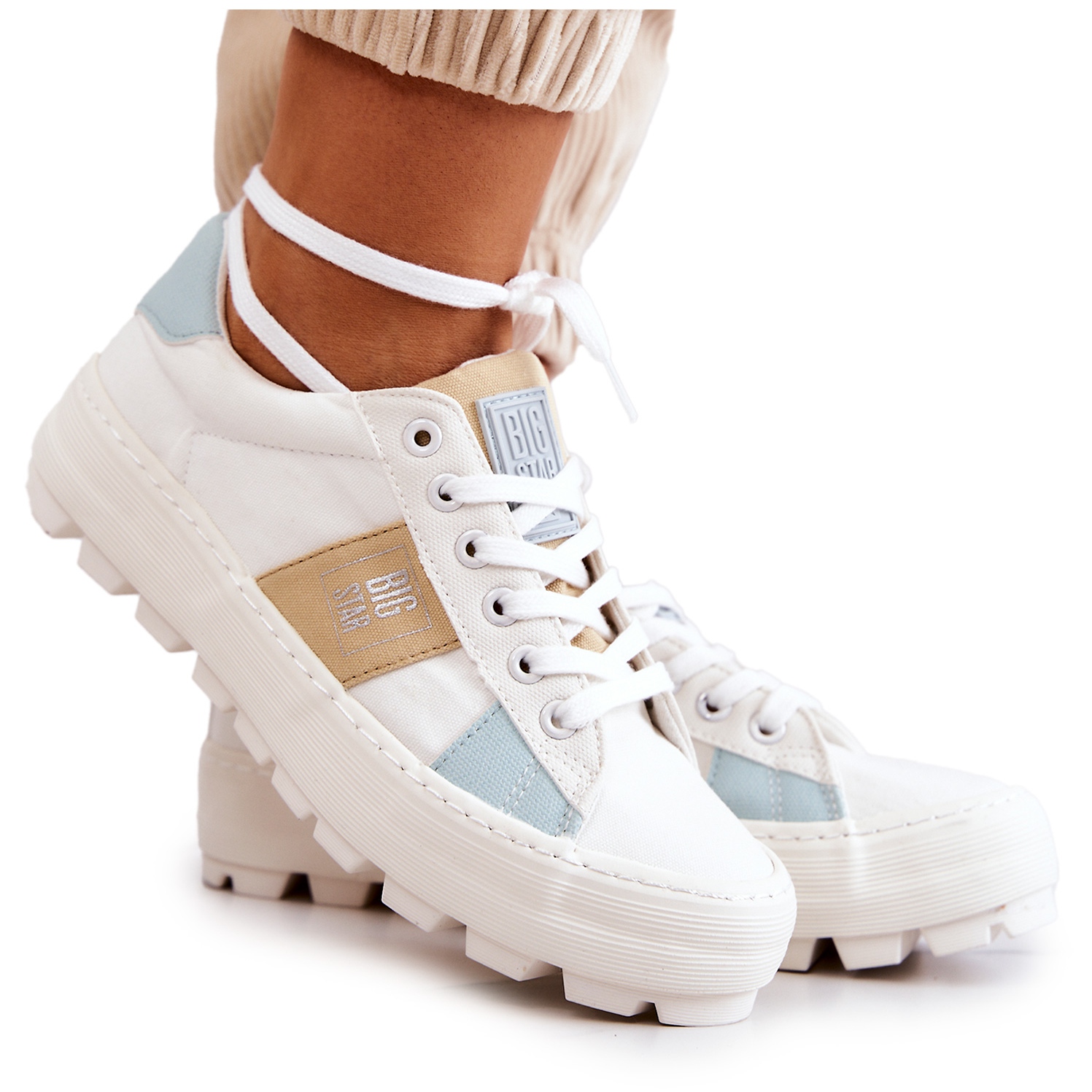 Platforma masivă, anti-alunecare, cu înălțimea de 3 cm, ridică ușor silueta, asigurând în același timp stabilitate pe suprafețele neuniforme. Șiretul clasic permite o potrivire confortabilă la picior, ceea ce le face o alegere ideală pentru ieșirile de zi cu zi și pentru multe stiluri - de la casual la puțin mai elegant.