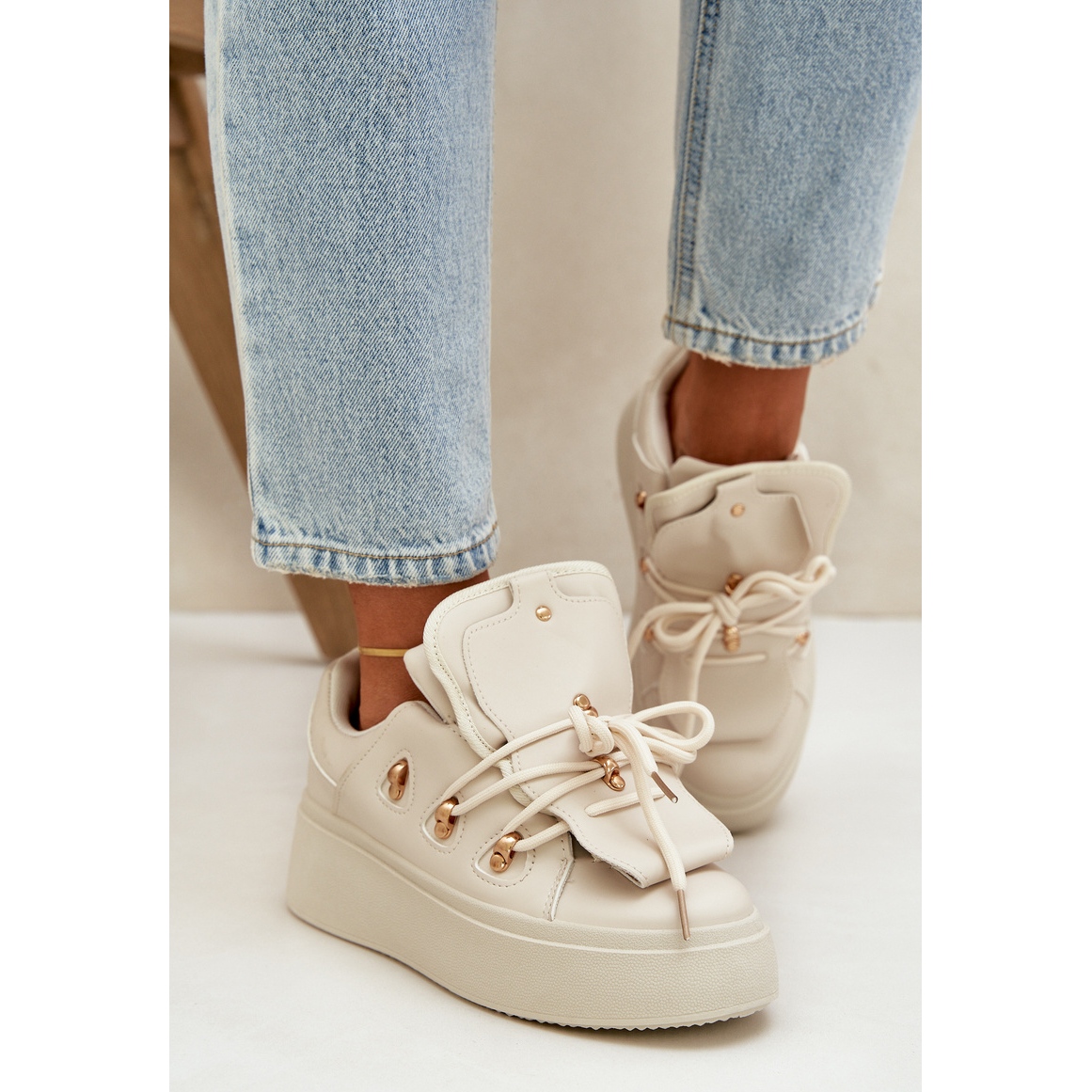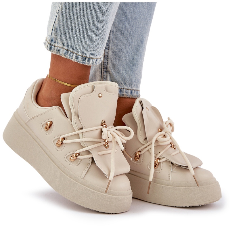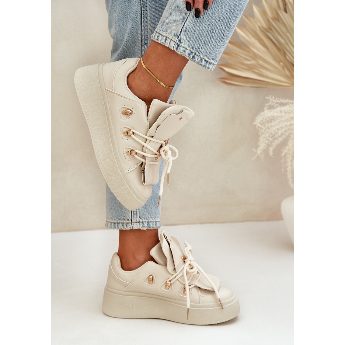Adidașii pentru femei de pe platforma din Beige este o necesitate a fiecărei femei la modă. Fabricate din piele ecologică de înaltă calitate, nu numai că arată elegante, dar sunt și ecologice. Platforma lor masivă nu numai că îți va prelungi optic figura, dar, de asemenea, va asigura stabilitatea și confortul atunci când purtați.