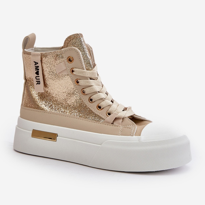 Pantofii de damă cu platformă înaltă Bej și Aur sunt alegerea perfectă pentru fiecare femeie la modă care dorește să îmbine confortul cu un stil modern. Acești adidași eleganti au un material strălucitor care atrage privirea și adaugă un pic de strălucire oricărei ținute. Platforma masivă de cauciuc de 4,5 cm înălțime nu numai că adaugă câțiva centimetri înălțime, dar garantează și un confort incredibil în timpul utilizării de zi cu zi.