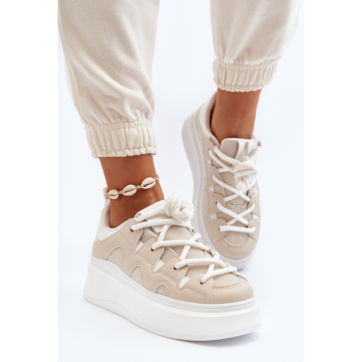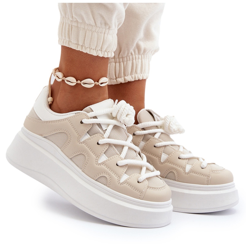 Vă prezentăm cel mai recent hit din oferta noastră - Tenisi de damă cu șireturi groase într-o nuanță de bej clasic. Aceasta este o combinație unică de stil și confort, care va atrage orice femeie care apreciază un aspect la modă și confortul de zi cu zi.