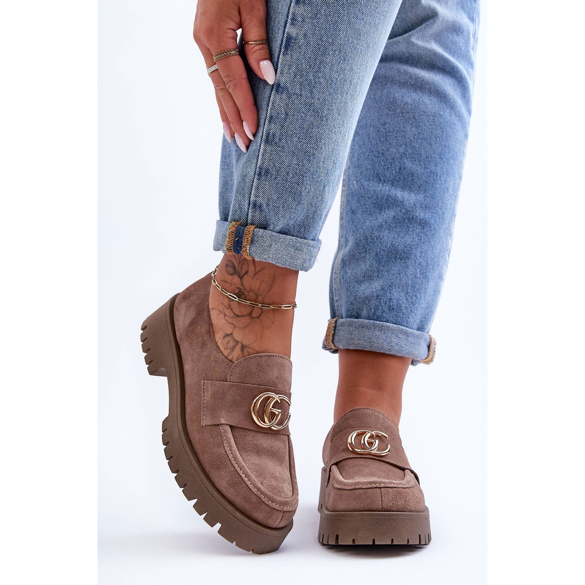 Încălțăminte elegantă, universală, din piele naturală din piele de căprioară. Modelul înclinat încorporat pe o platformă masivă și un toc plat, plat, cu o înălțime de 4 cm, ceea ce asigură confortul de a purta toată ziua. Interiorul căptușit cu o talpă naturală din piele, iar talpa de cauciuc rezistentă la abraziune garantează o aderență bună. Sub limbă există o ștergătoare astringentă practică care adaptează pantoful la picior, iar jeturile discrete adaugă un personaj subtil, la modă.