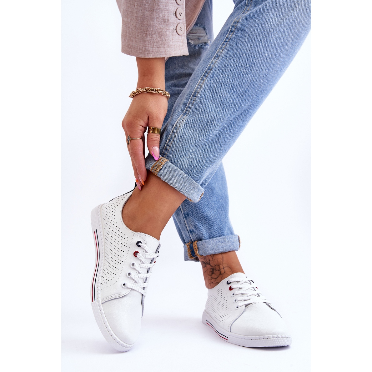 O propunere ușoară, elegantă și aerisită pentru zile mai calde - adidași cu ferone joase din piele naturală. Supertul deschis oferă o ventilație excelentă, iar inserția de confort moale din piele naturală garantează confortul pe tot parcursul zilei. Modelul este setat pe o platformă de 2 cm cu o talpă de cauciuc, non -all. Ședințele cu un fir decorativ adaugă un personaj subtil, iar culoarea albă clasică se poate potrivi cu ușurință cu stilizările zilnice.